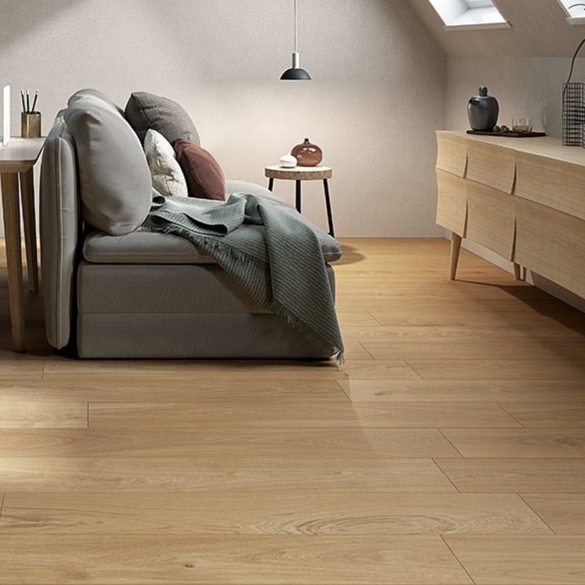 Мягкий, приятный цвет, плитка под дерево ,смотрится как реальная деревяшка! Положили на пол в коридоре, выглядит очень классно!