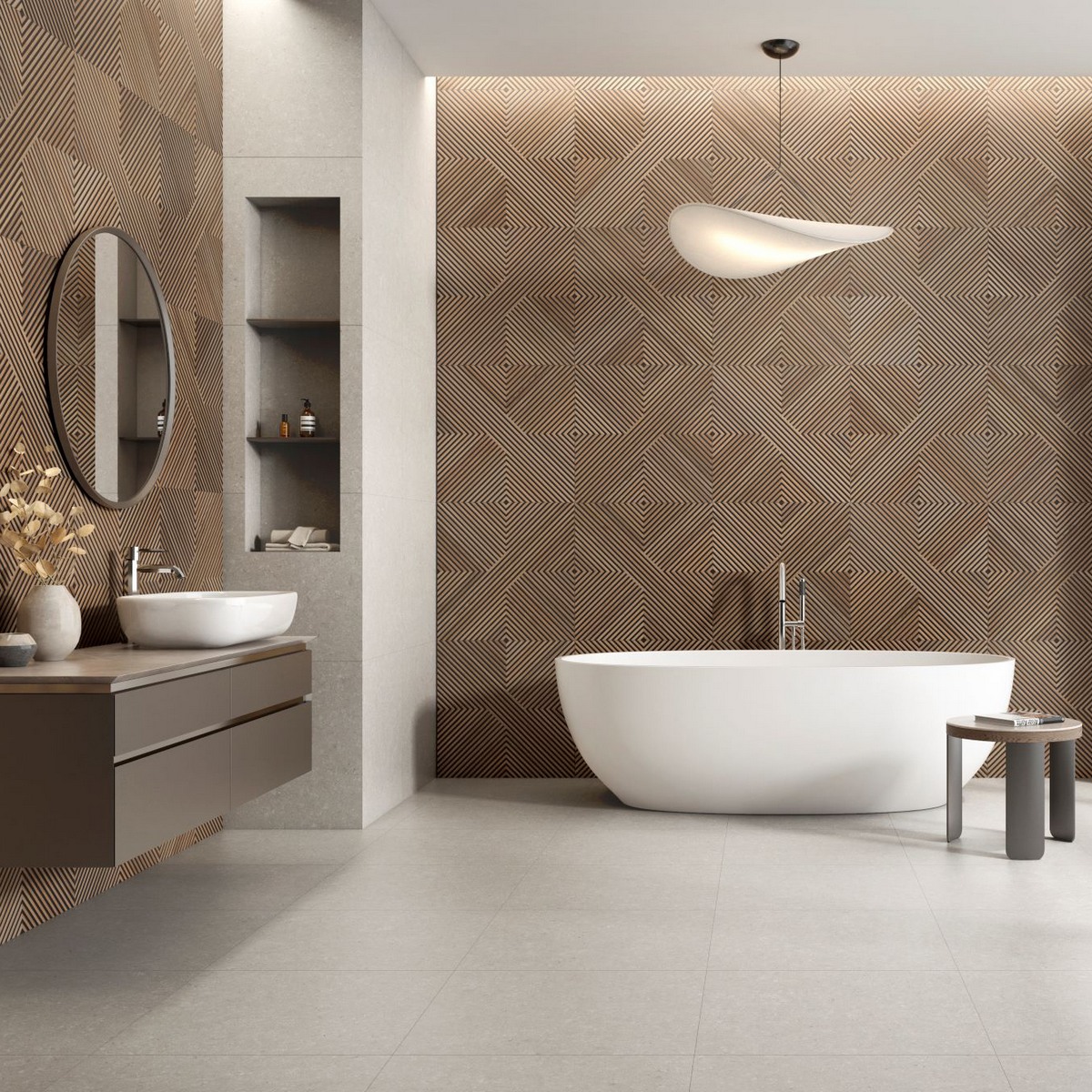 Очень эффектная плитка под дерево! Вживую выглядит ещё интереснее — тёплые оттенки дерева сочетаются с графичностью, создавая динамичный, но при этом уютный интерьер.