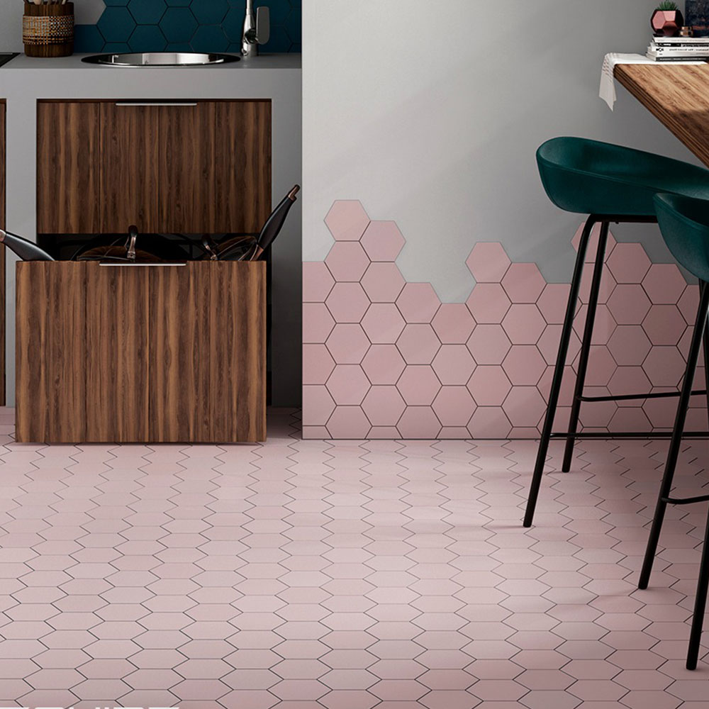 Нежная розовая плитка из керамогранита в форме шестигранника выглядит очень мягко и уютно. Такая плитка для пола и стен создаёт тёплую атмосферу, просто прелесть.