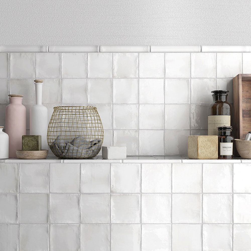 Компактная квадратная плитка белого цвета визуально увеличивает пространство. Универсальное решение для кухни, ванной или санузла.