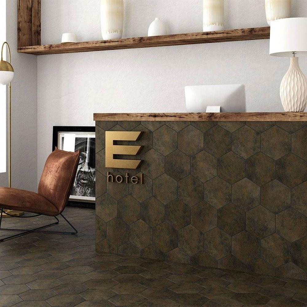 Керамогранит Equipe Oxide Negro 17.5x20 имеет коричневый цвет, который напоминает металл. Благодаря своей износостойкости, плитка подходит для использования в качестве напольного покрытия.