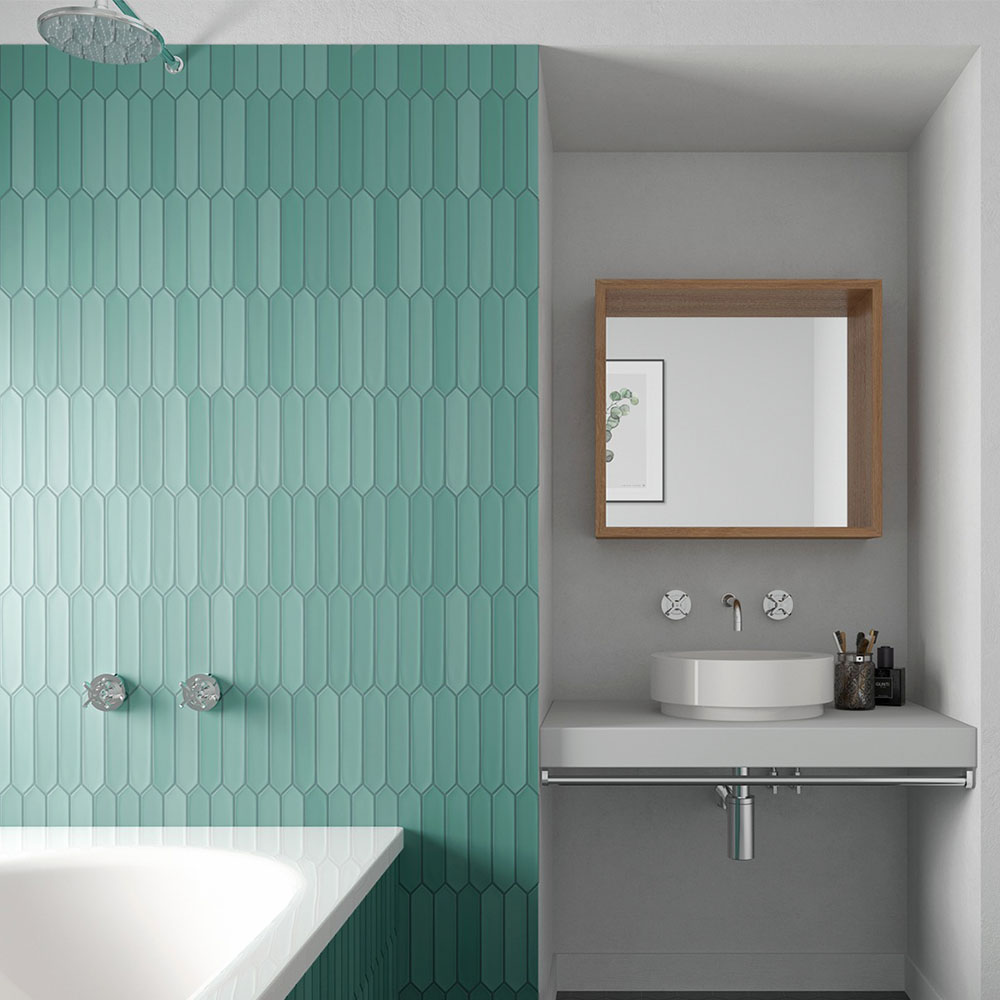 Уложил зелёную плитку в форме стрелки на кухонный фартук. Цвет сочный, поверхность ровная и приятная, смотрится современно и освежает интерьер.