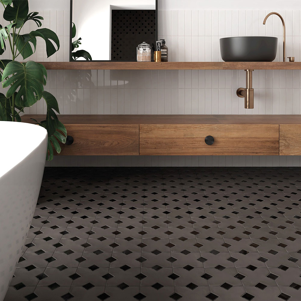 Маленькая чёрная плитка из керамогранита отлично подходит как вставка между плитками. Матовая плитка создаёт стильный контраст и выглядит просто супер.