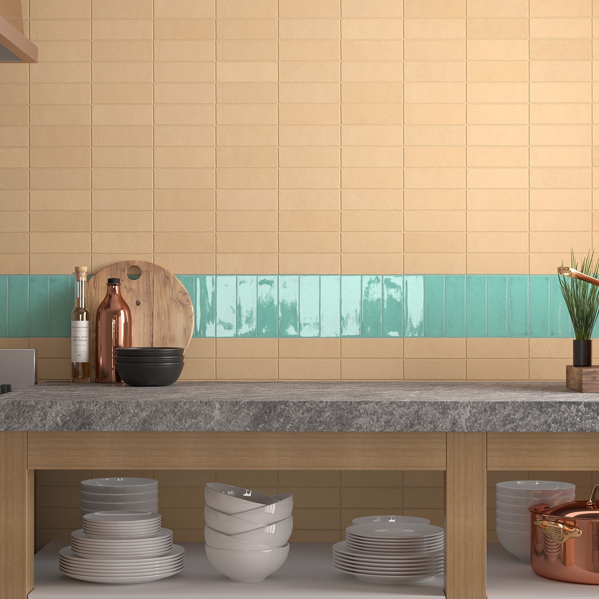 Плитка приятного песочного оттенка, матовая поверхность выглядит естественно. Настенная плитка из Испании лёгкая в уходе, хорошо сочетается с деревом и светлыми фасадами на кухне.