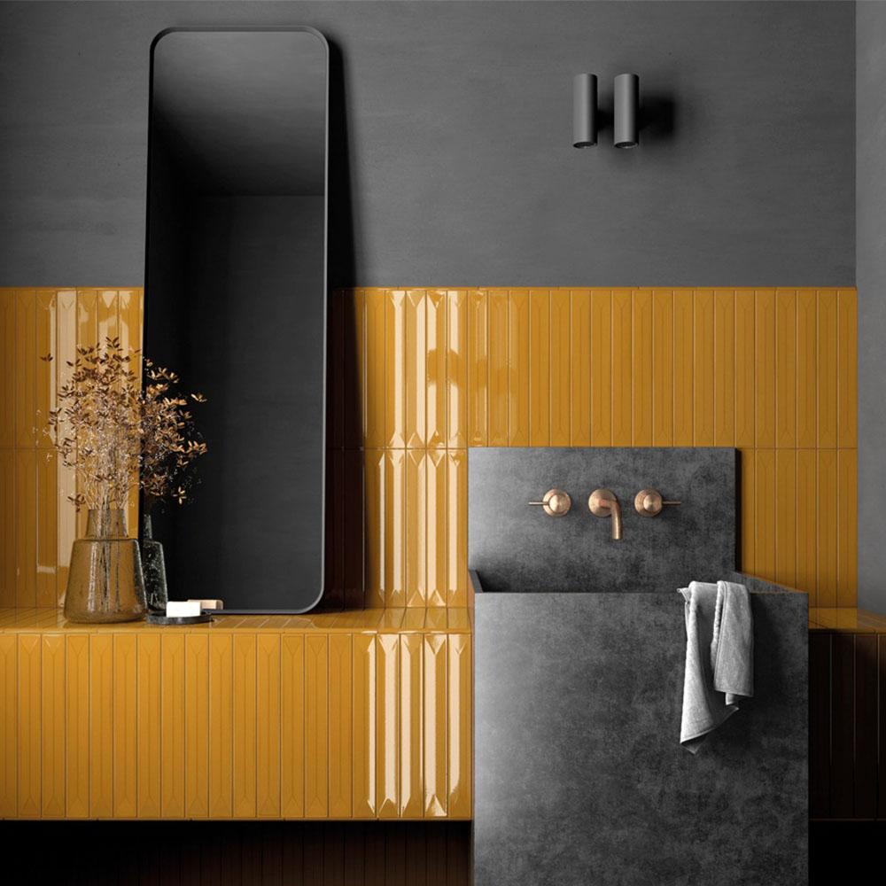 Коллекция Vitral от производителя Equipe воплощает в себе стиль ар-деко. Прямоугольная фигурная плитка с геометрическим узором выполнена в жёлтом цвете, что придаёт ей особую выразительность.
