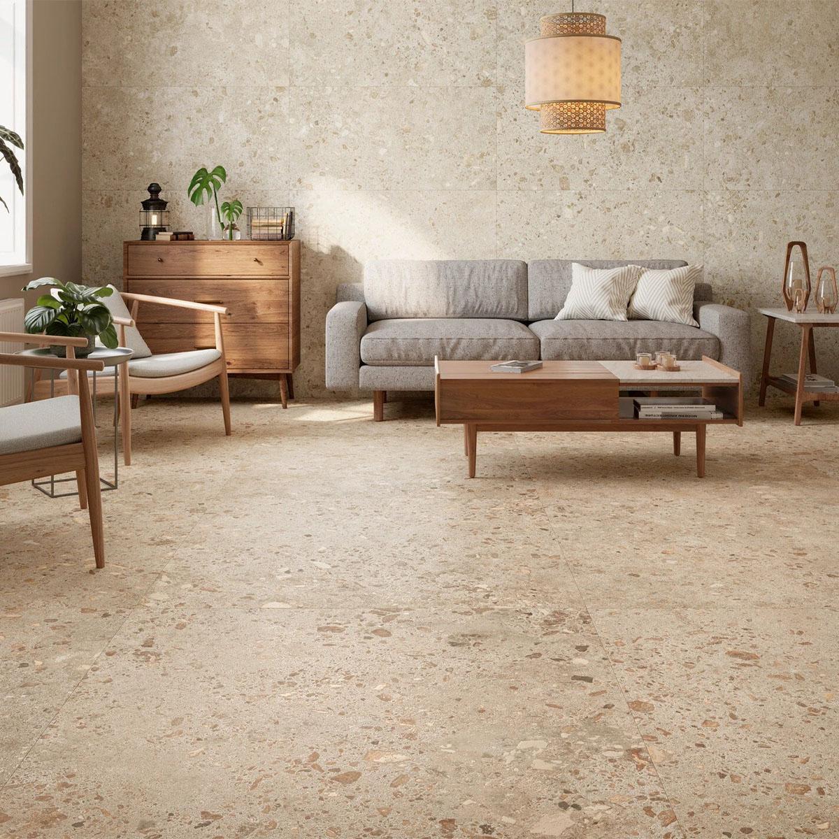 Керамогранит морозостойкий, что делает его подходящим для использования в помещениях с перепадами температур. Матовая поверхность плитки под камень создаёт эффект натуральности и придаёт интерьеру особый шарм в стиле лофт.
