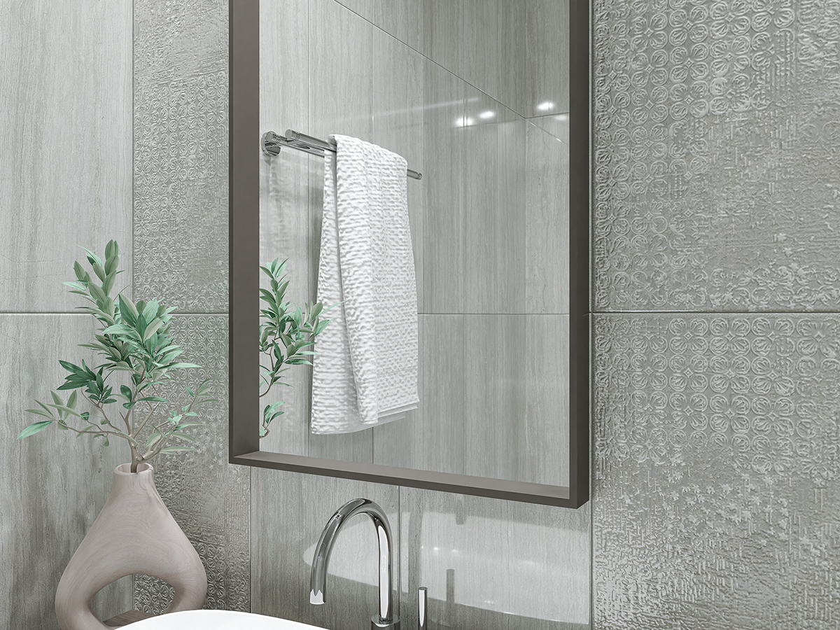 Цвет плитки — серый, который гармонично сочетается с различными оттенками и материалами. Орнамент придаёт плитке изысканный вид, делая интерьер более выразительным.