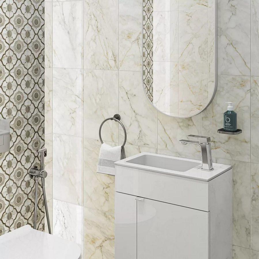 Коллекция «Кантата» отличается элегантным дизайном и безупречной белизной, которая придаёт помещению свежесть и лёгкость. Глянцевая поверхность плитки не только красива, но и практична: она устойчива к загрязнениям и легко очищается.
