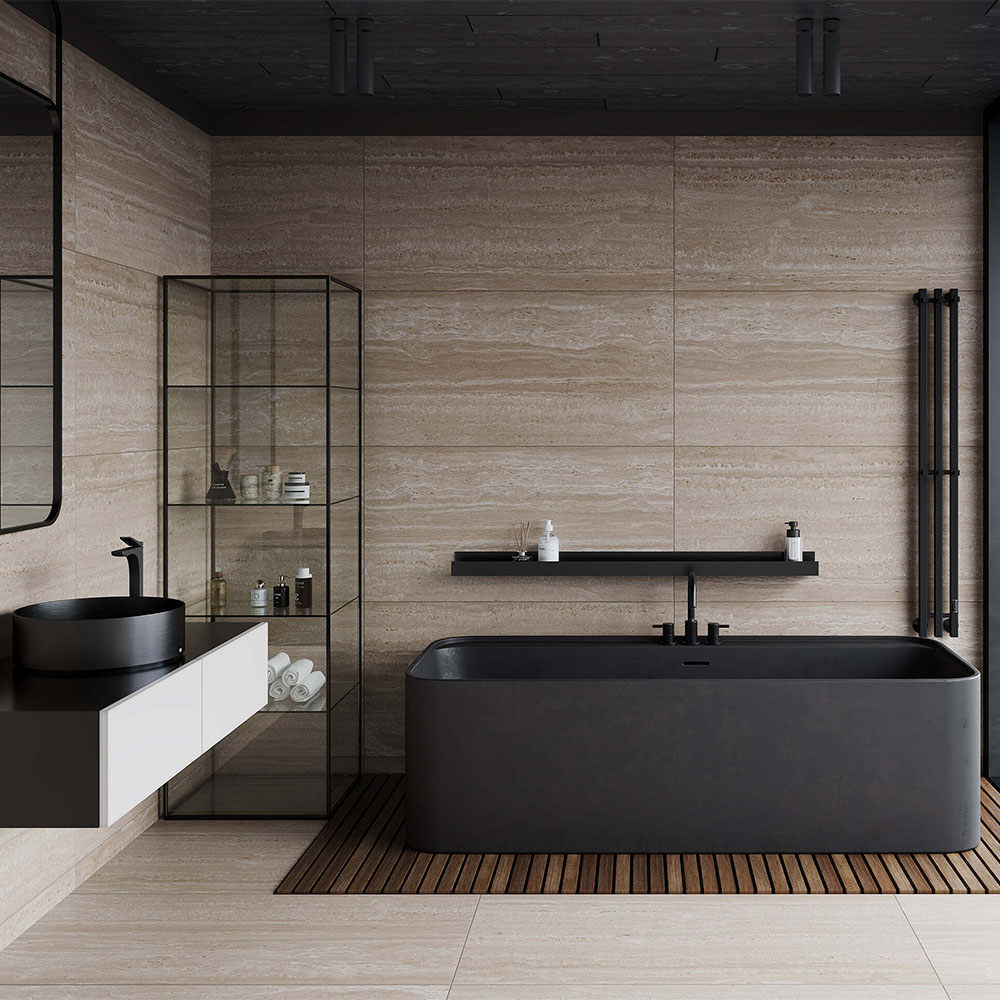 Лаппатированная поверхность плитки создаёт эффект натурального камня, придавая помещению особый шарм. Размер плитки 60x120 удобен для укладки и позволяет минимизировать количество стыков.