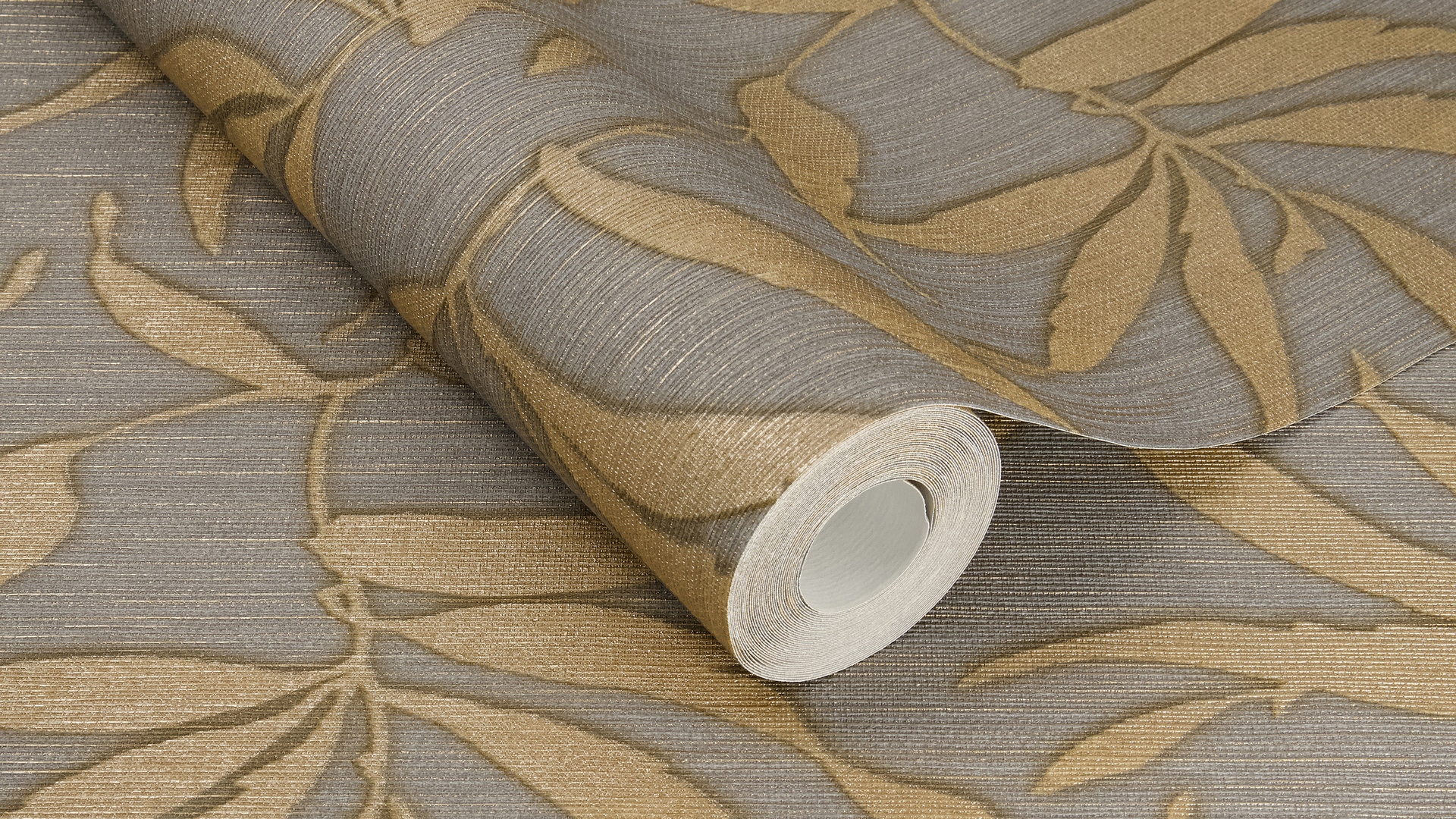Обои выполнены в сером цвете и украшены изысканным узором с листьями, что придаёт помещению особый шарм и уют. Благодаря флизелиновой основе обои легко клеить, они не рвутся и не деформируются после высыхания. Виниловое покрытие делает их моющимися, что обеспечивает долговечность и сохранение первоначального вида.