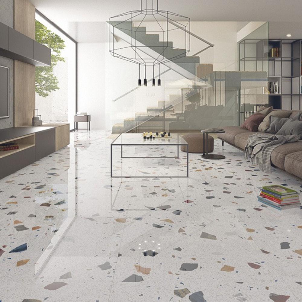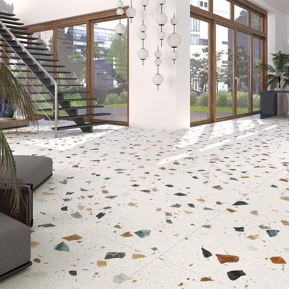 Плитка имеет размер 80x80 см, что обеспечивает удобство укладки и позволяет минимизировать количество стыков. Белый цвет добавляет света и пространства в помещение, делая его более воздушным и современным.