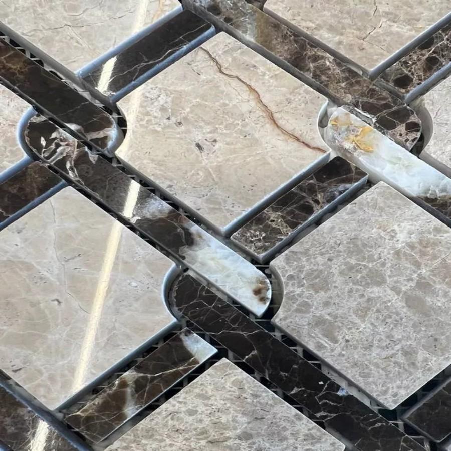 Colori Viva Emperador Бежевая из камня разноформатная 28.4x32.2 — это глянцевая геометрическая мозаика из Китая, выполненная в серых оттенках. Она идеально подойдёт для отделки стен в современном интерьере.