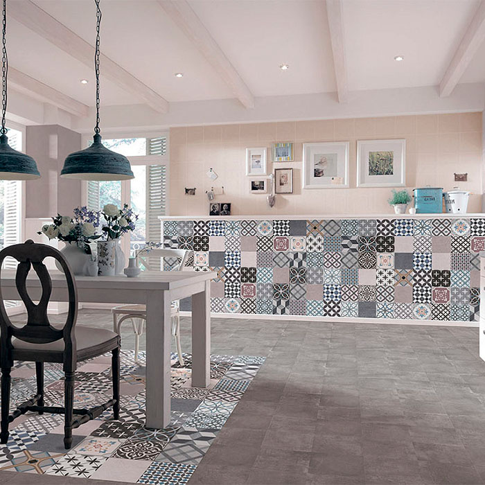 Коллекция выполнена в стиле пэчворк, что делает её особенно интересной и выразительной. Многоцветная палитра плитки позволяет сочетать её с различными элементами интерьера.