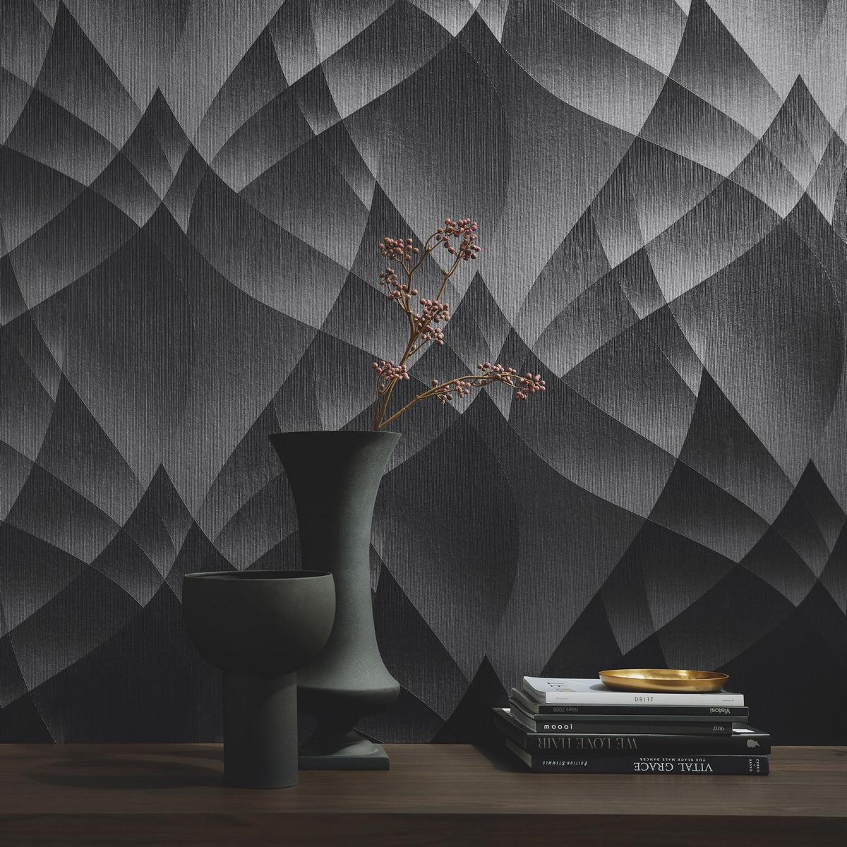Обои имеют геометрический узор и выполнены в чёрном цвете, что делает их универсальным решением для любого стиля интерьера. Благодаря флизелиновой основе, обои легко клеятся и не деформируются после высыхания.
