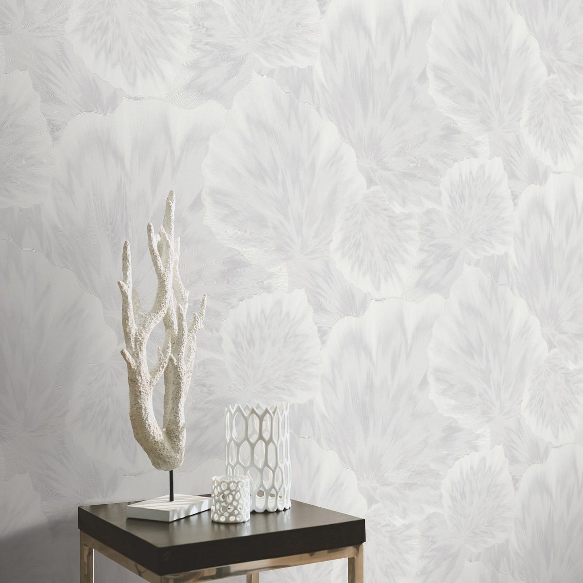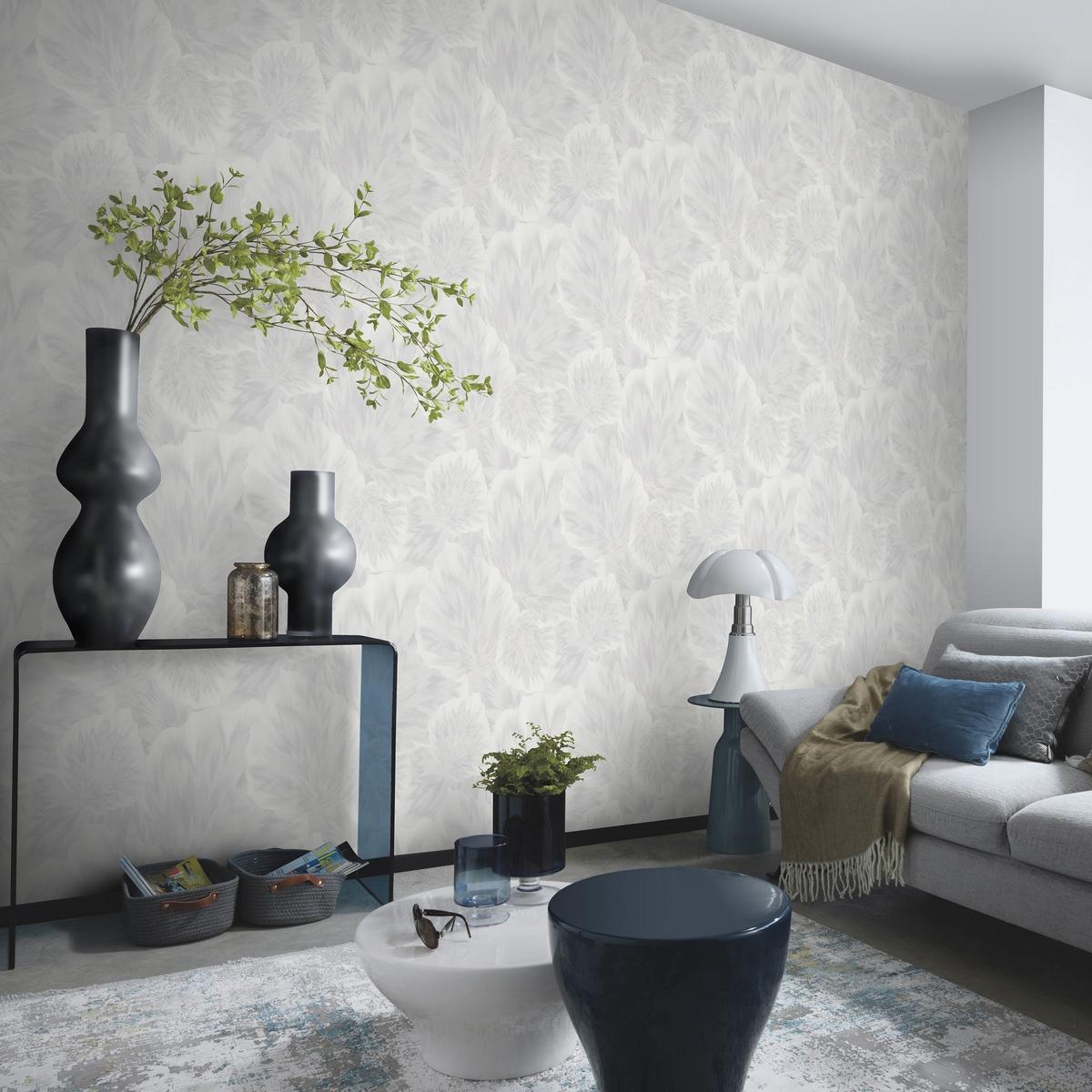 Белый цвет обоев создаёт ощущение простора и свежести, а их рельефная текстура добавляет интерьеру изысканности и элегантности.