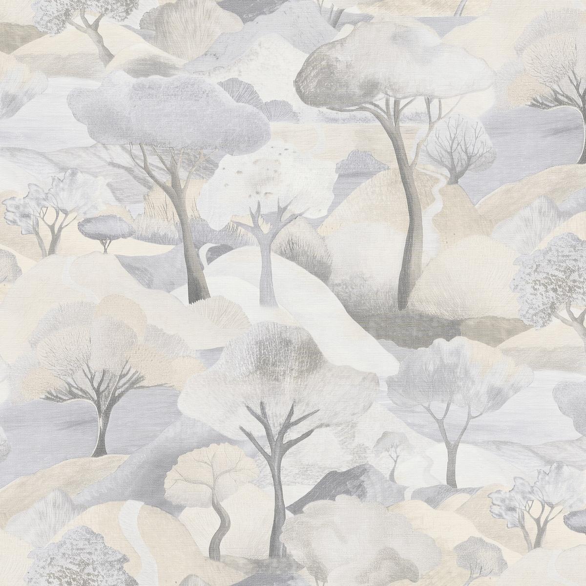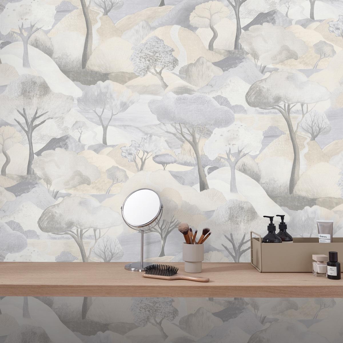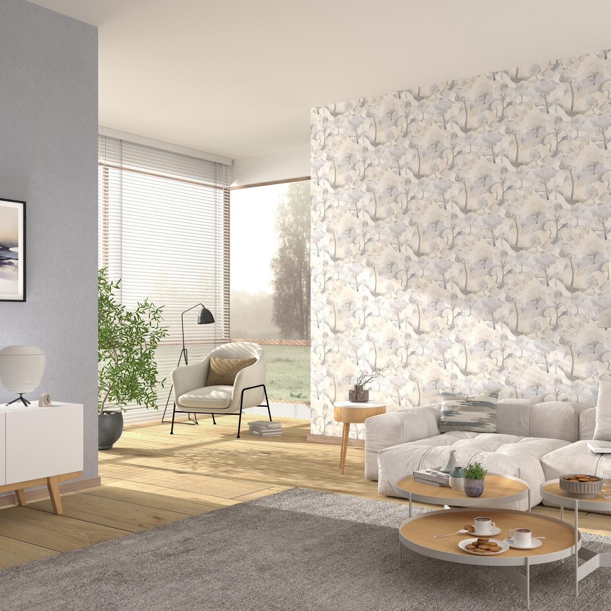 Дизайн обоев вдохновлён природными мотивами — на светлом бежевом фоне изящно изображены деревья. Этот рисунок добавляет интерьеру лёгкости и свежести, создавая атмосферу гармонии и спокойствия.