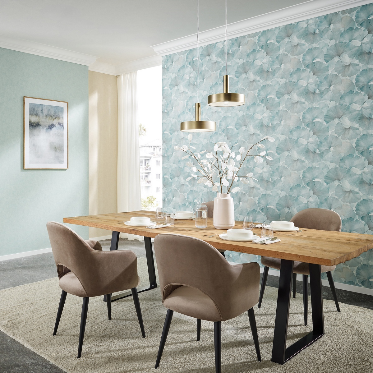 Размер обоев — метровые, что упрощает процесс поклейки и позволяет сэкономить время и силы. Бирюзовый цвет коллекции добавит свежести и оригинальности в ваш интерьер.