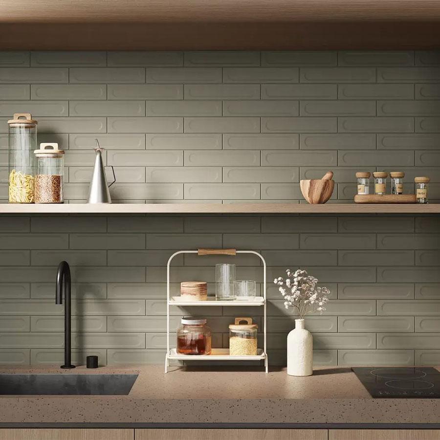 Плитка имеет матовый оттенок зелёного цвета, который придаёт помещению свежесть и уют. Размер плитки — 6x28,5 см, что обеспечивает удобство монтажа и позволяет создавать интересные композиции.