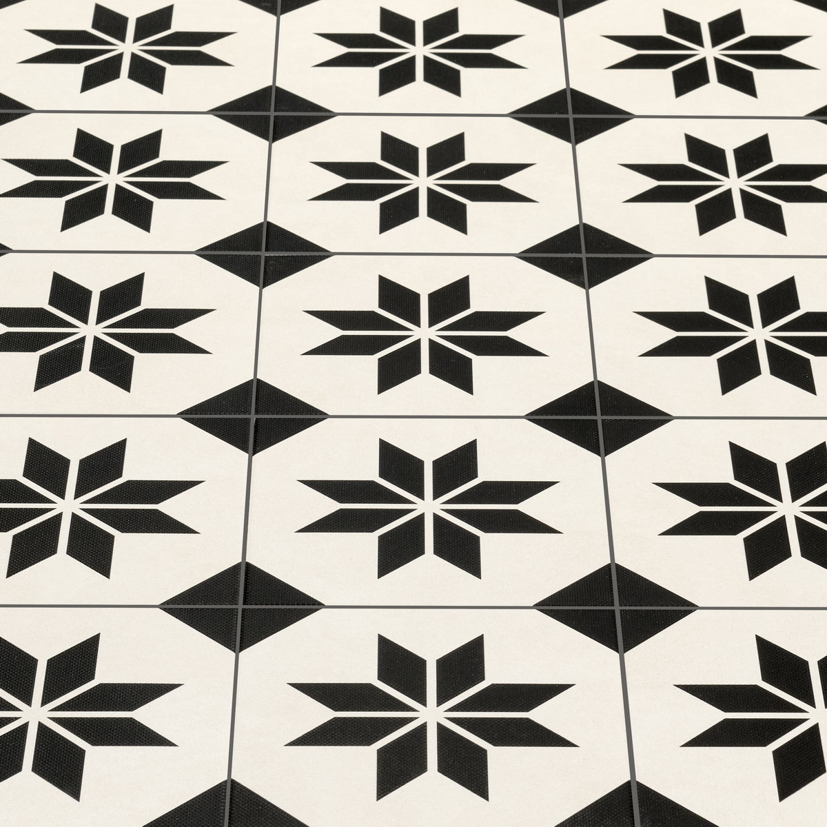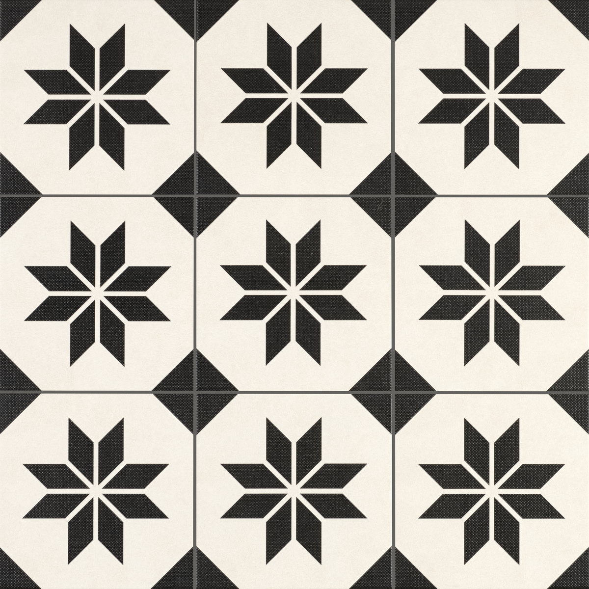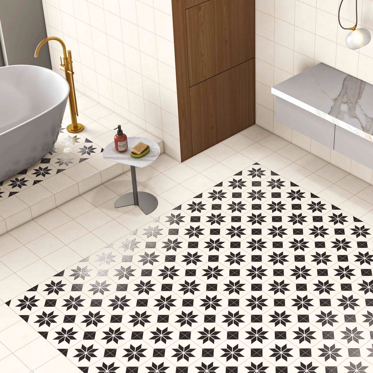 Керамогранит имеет матовую поверхность и квадратную форму. Его цвет — бежевый с серыми геометрическими элементами, что придаёт декору мавританский колорит.