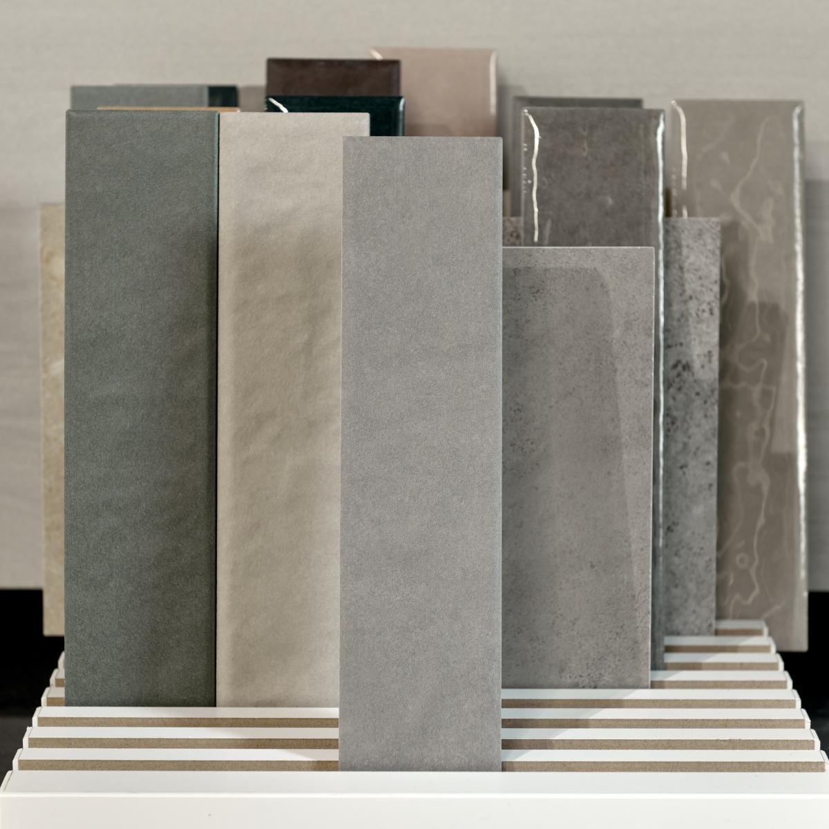 Размер плитки — 6x25 см, что позволяет удобно и быстро выполнить укладку. Керамогранит матовый, с текстурой, имитирующей бетон. Мавританский серый цвет придаёт помещению изысканность и элегантность.