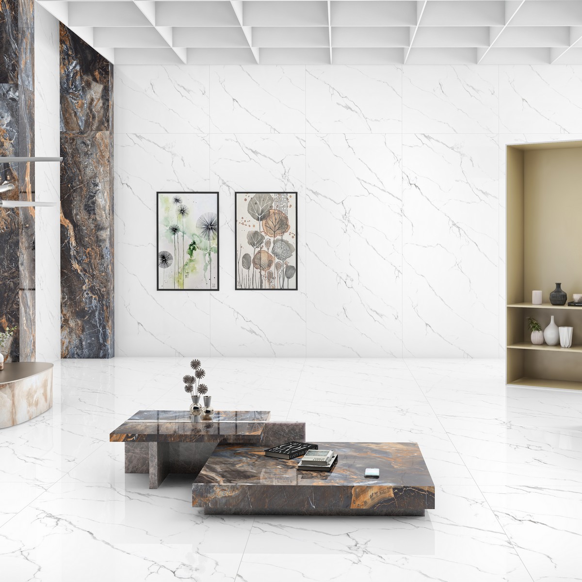 - Под мрамор: благодаря своему дизайну, плитка имитирует натуральный мрамор, придавая интерьеру изысканность и элегантность.