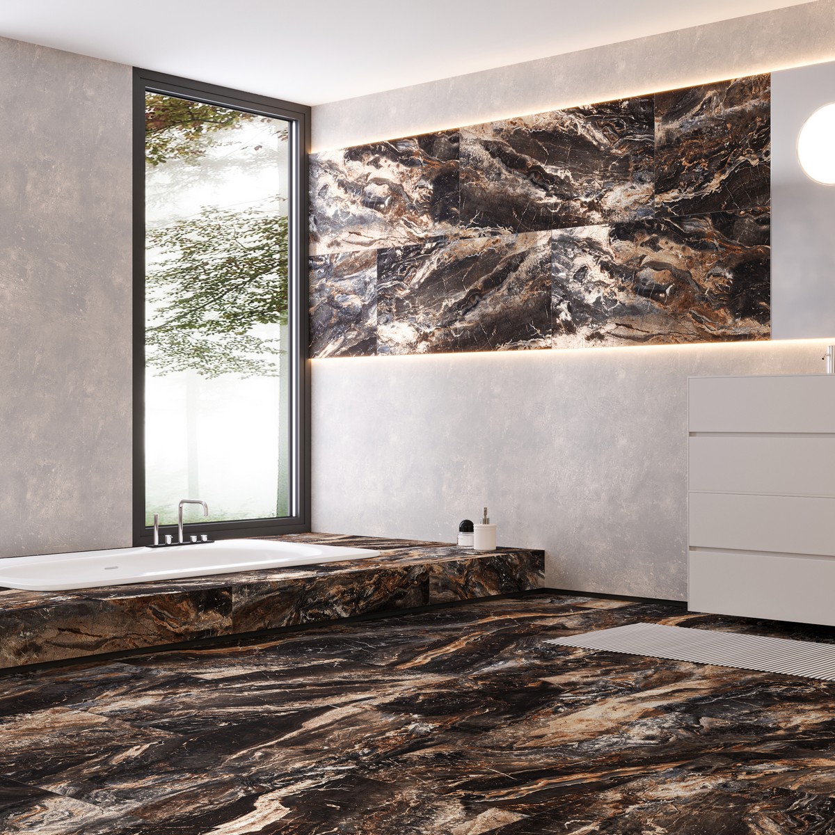 Очень красивая плита. Брали на акцентную стену в душевую, основную спокойную под бетон. Очень эффектная, на поверхности такие еще есть прожилочки. Брали в магазине на Профсоюзной, очень быстро определились с выбором, много разной плиты представлено. Рекомендую!