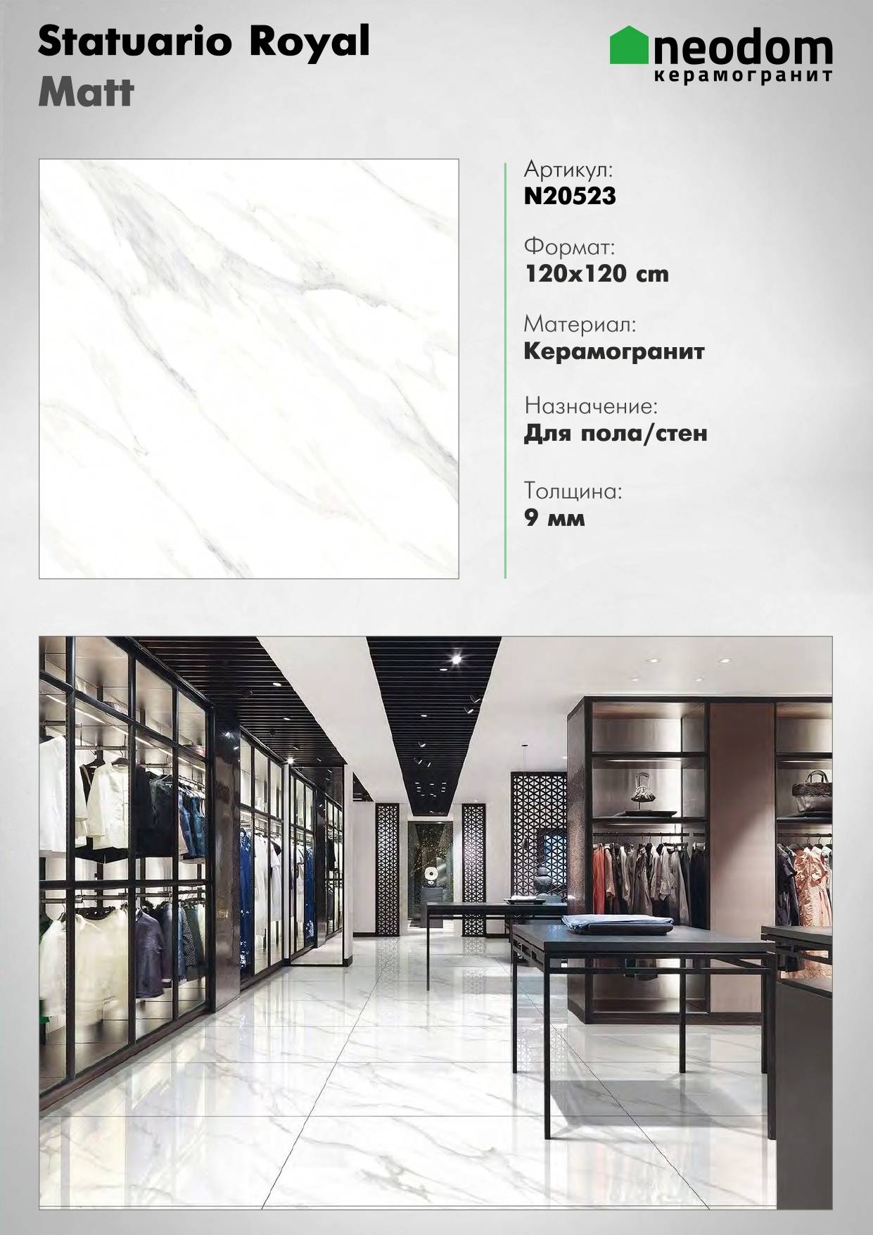 Тип: керамогранит — прочный и долговечный материал, который идеально подходит для пола.