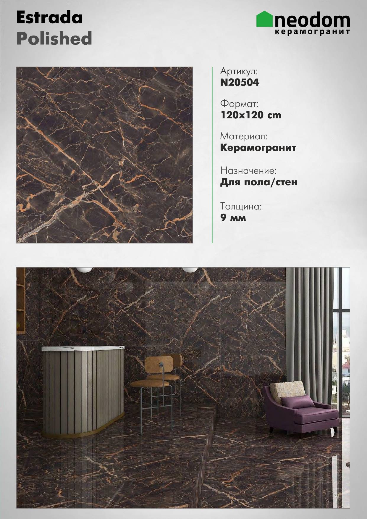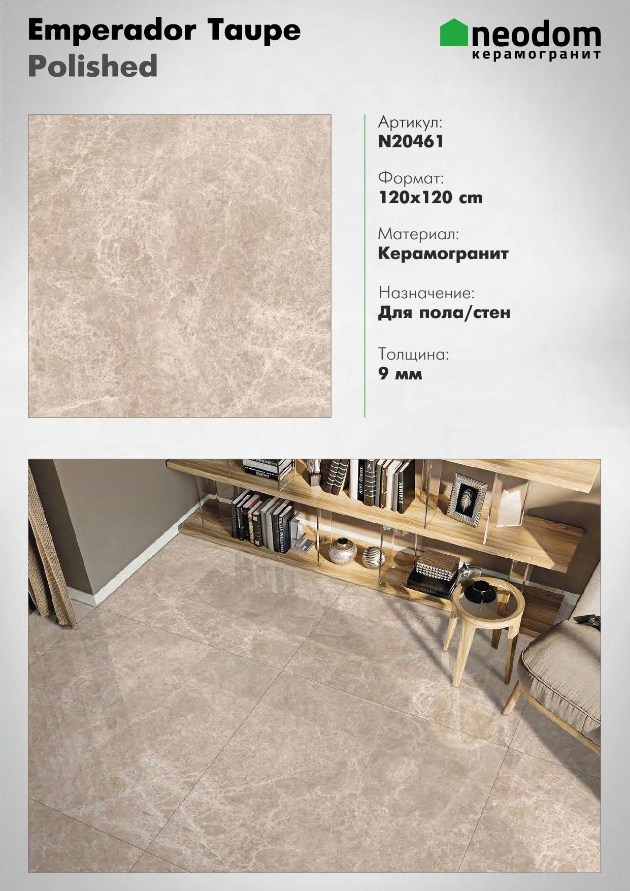 Обработка: полированная поверхность керамогранита придаёт ему блеск и гладкость, делая его приятным на ощупь.