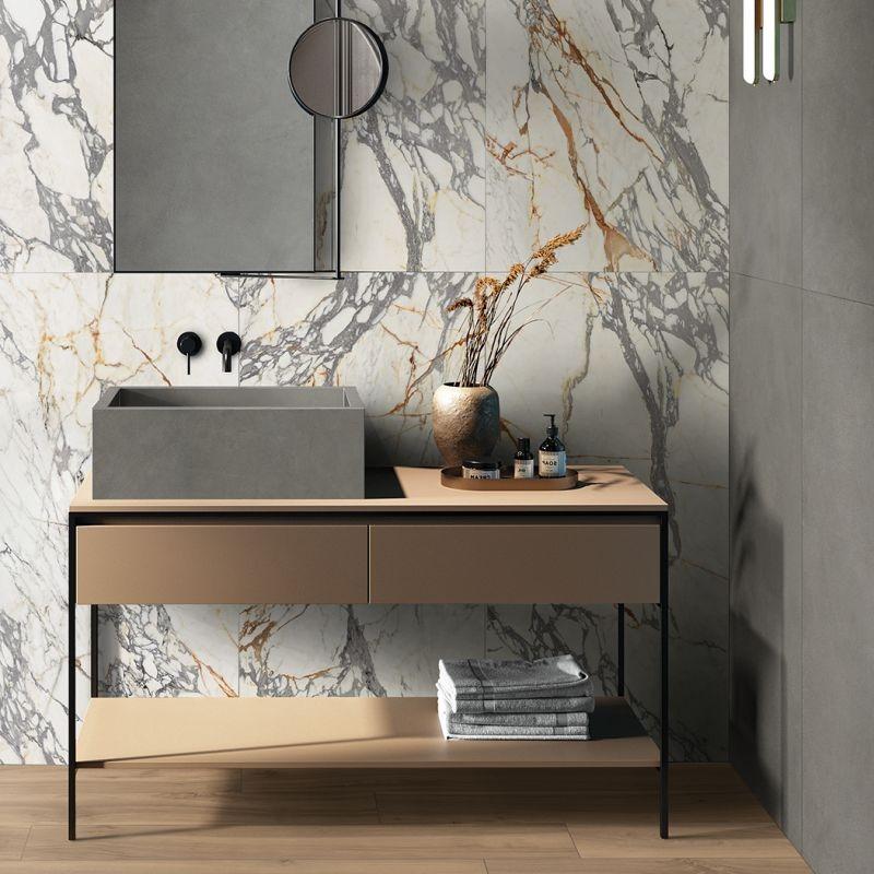 Плитка имеет удобные размеры 60x120 см, что облегчает её укладку и позволяет минимизировать количество стыков. Это делает керамогранит не только эстетически привлекательным, но и практичным решением для любого помещения.