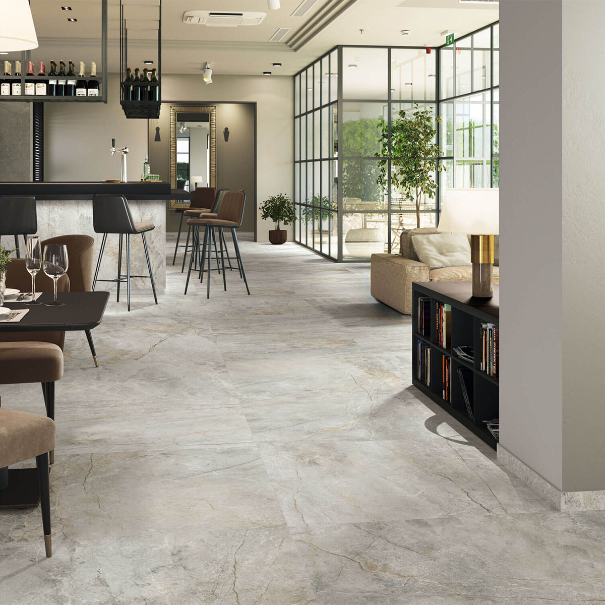 Плитка имеет серый цвет, который легко впишется в интерьер в стиле лофт. Керамогранит морозостойкий, что делает его идеальным выбором для помещений с перепадами температур.