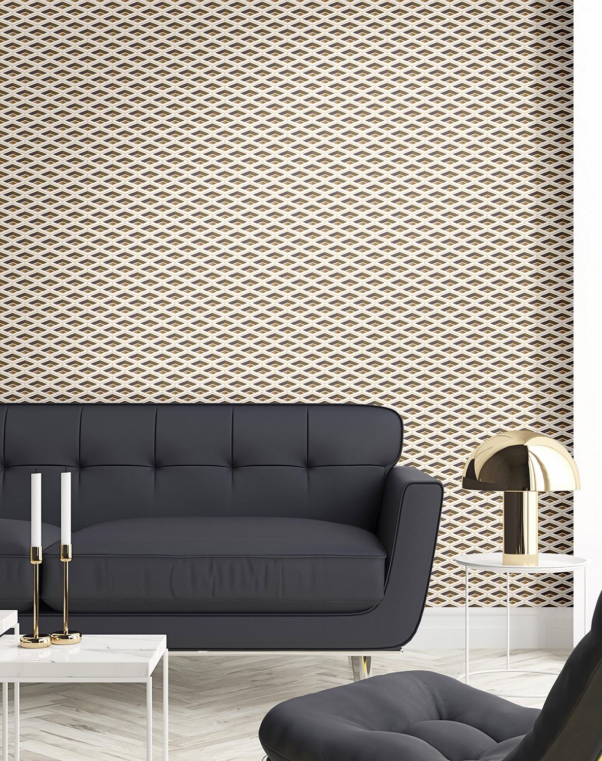 Цвет обоев — золотистый, что делает их универсальным решением для различных стилей интерьера. Они гармонично сочетаются с другими оттенками и материалами.
