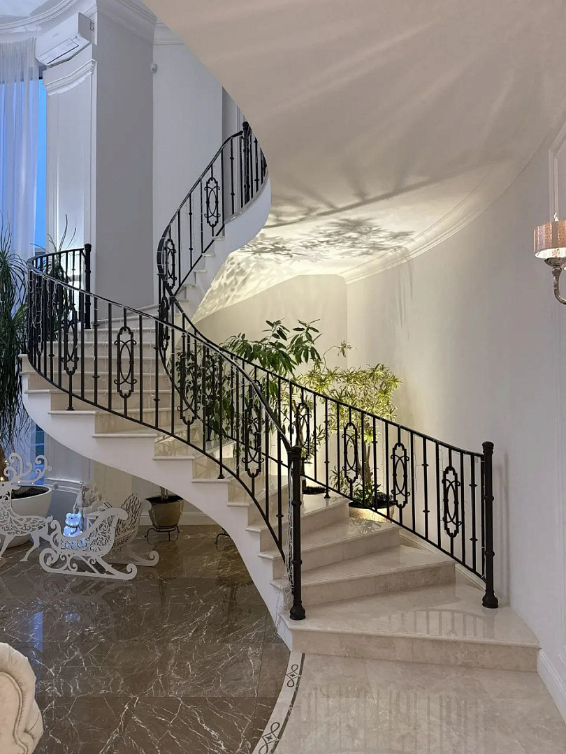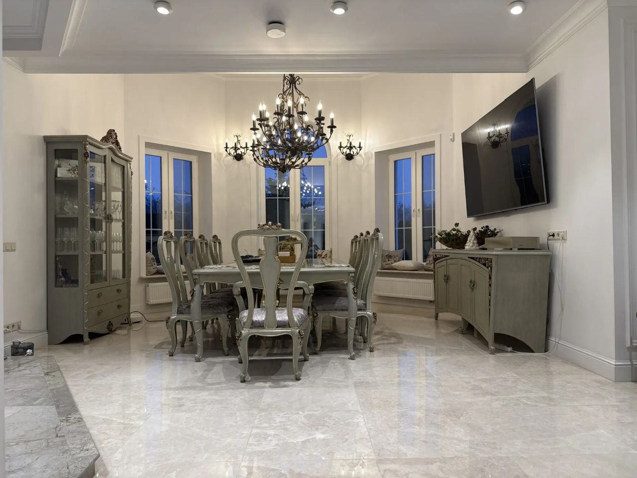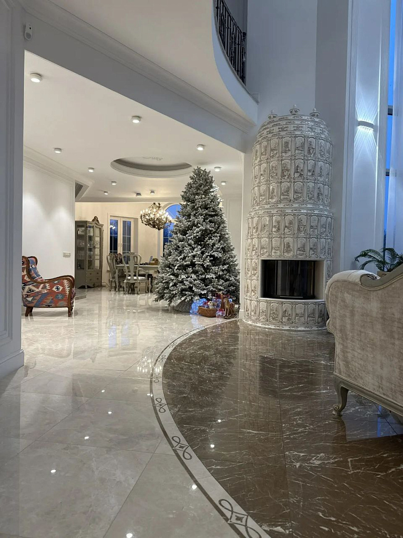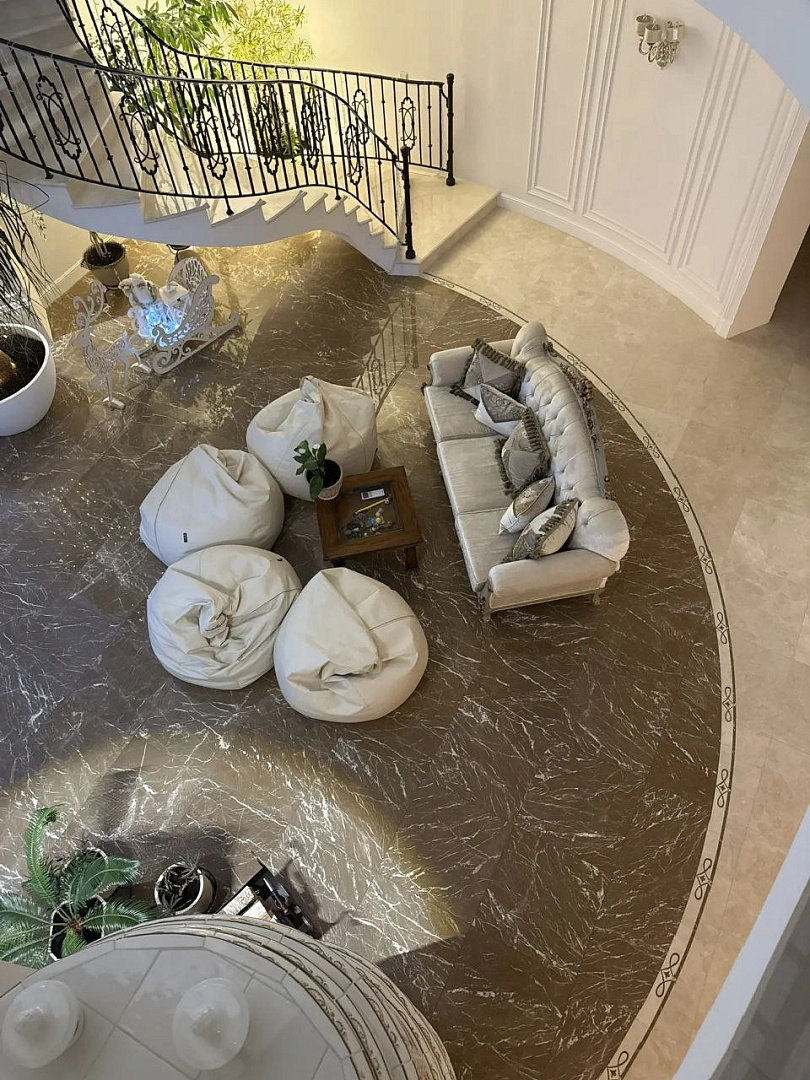 Пространство гармонично сочетает элегантность и функциональность, создавая комфортную и монолитную атмосферу для приема гостей и торжественных мероприятий.