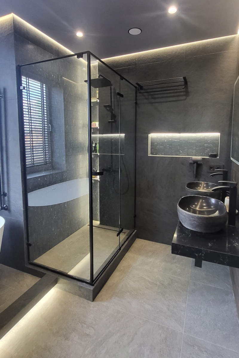 В нише парящие полочки с подсветкой выделяют душевую кабину.