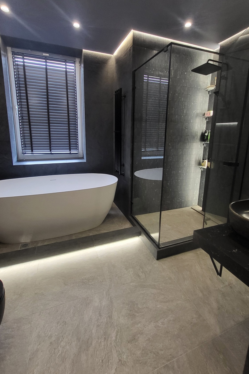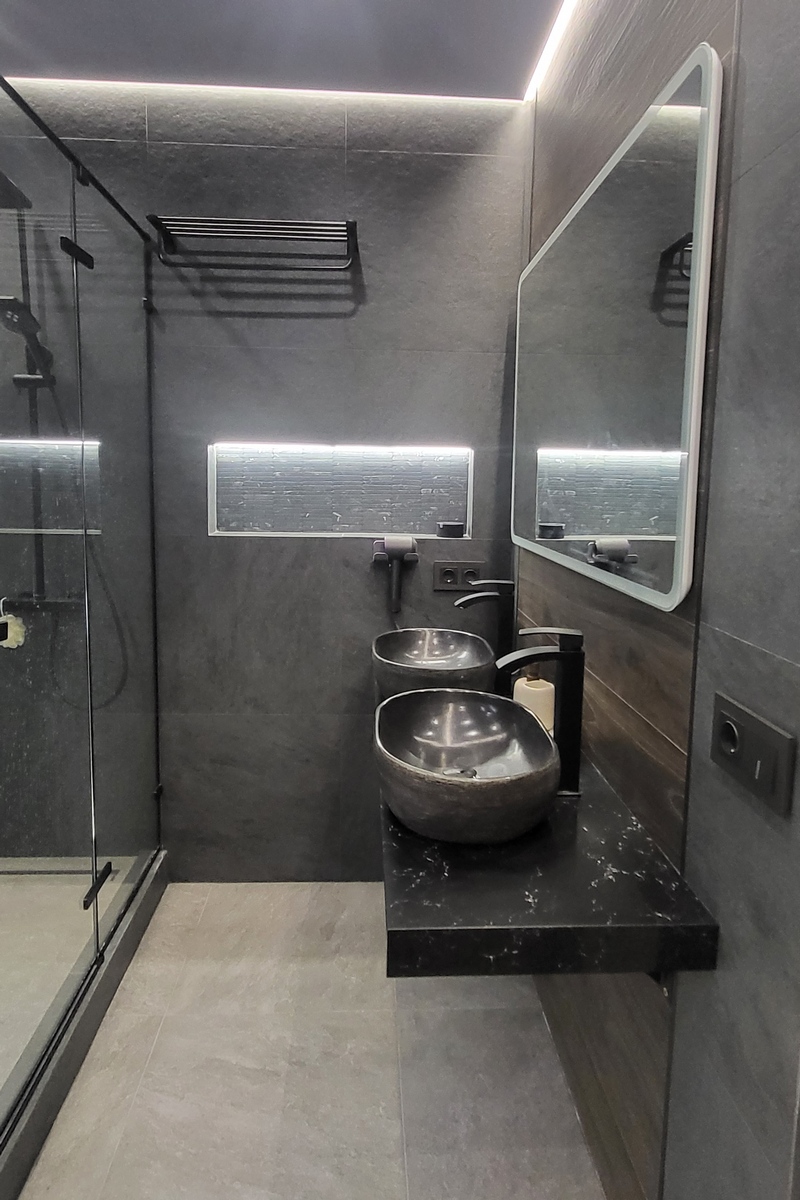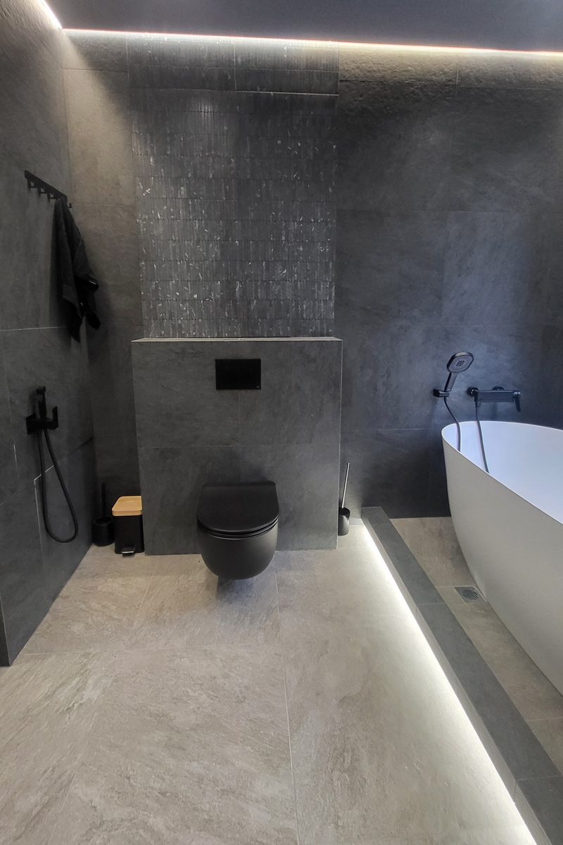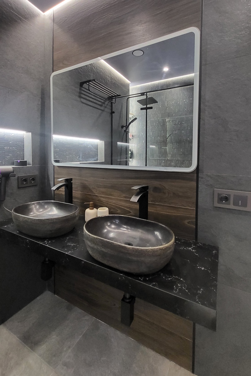 В современном санузле для молодого человека отдельно стоящая ванна с парящим подиумом сразу привлекает внимание, как только открываешь дверь. Стильный, просторный, брутальный санузел- это то, что нравится каждому мужчине!