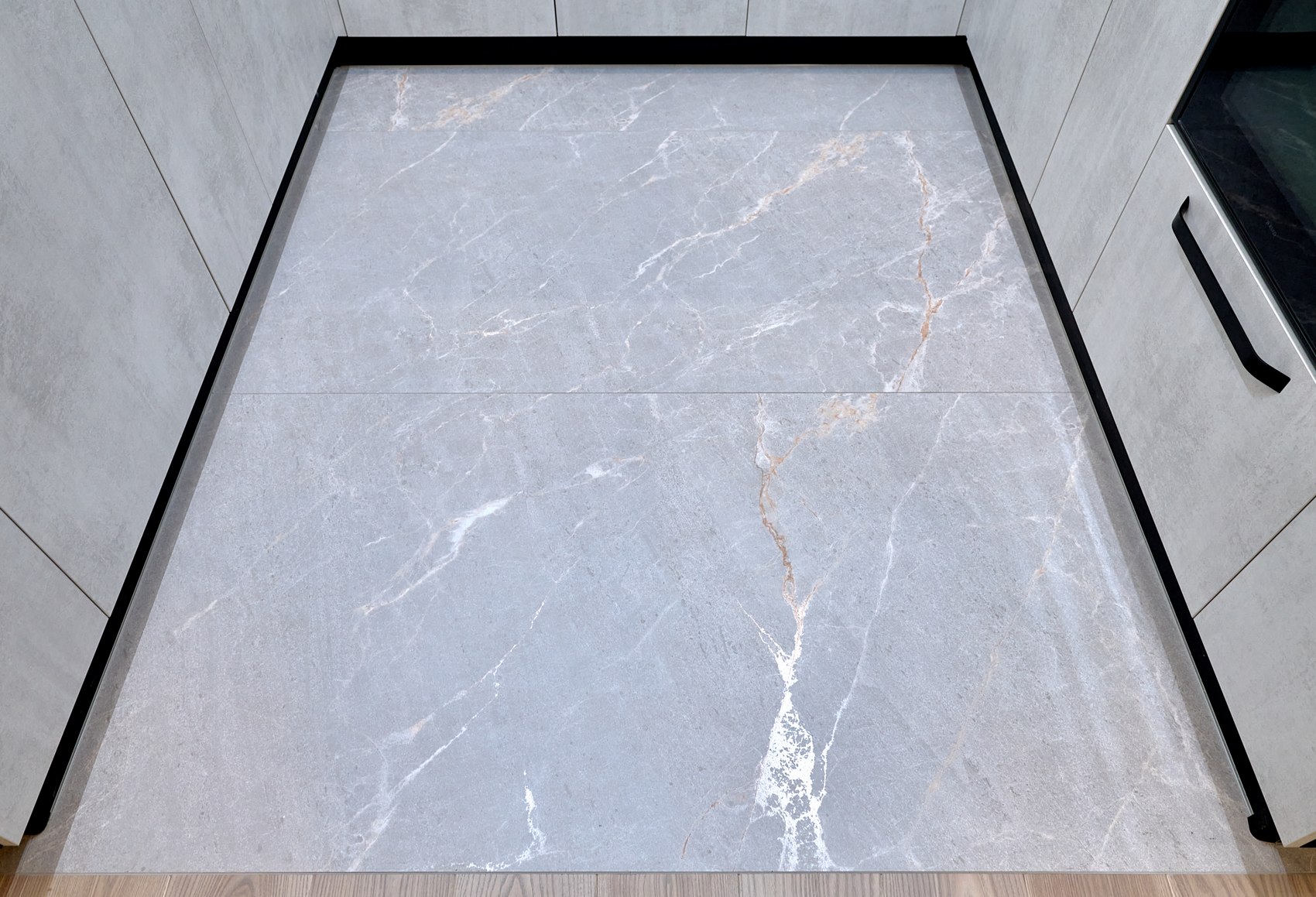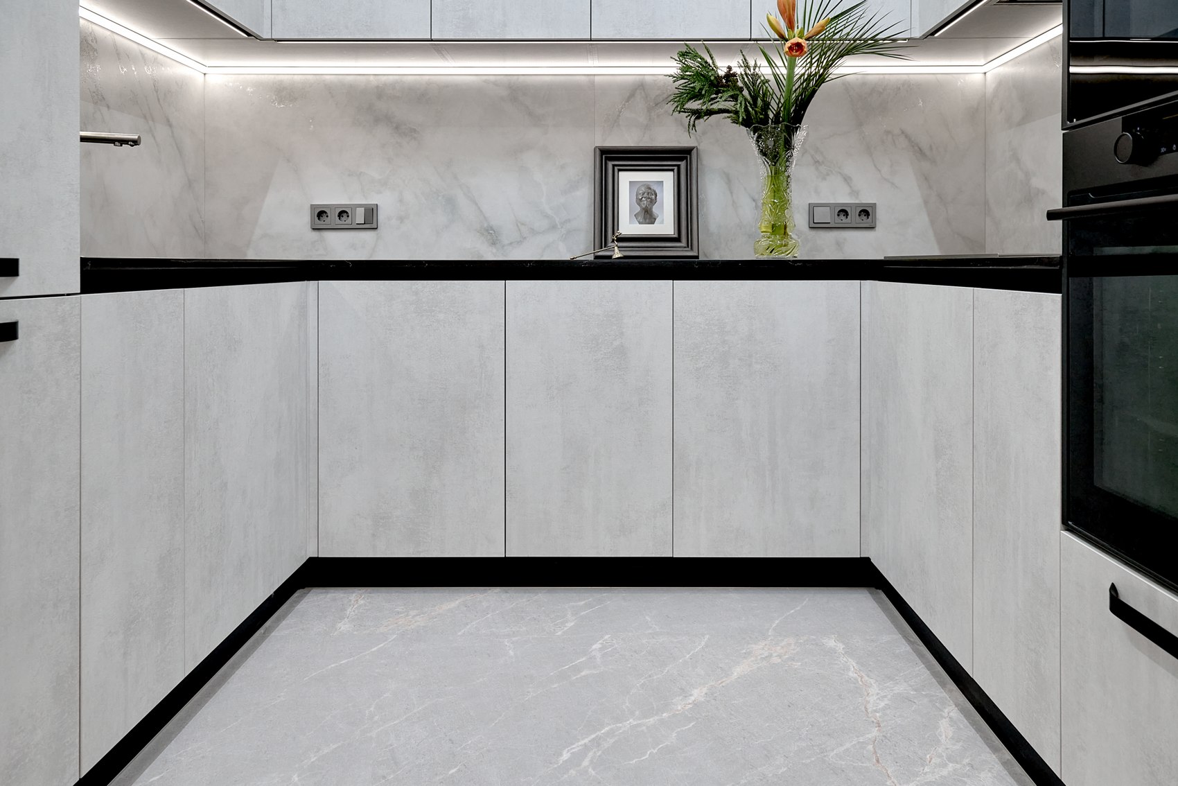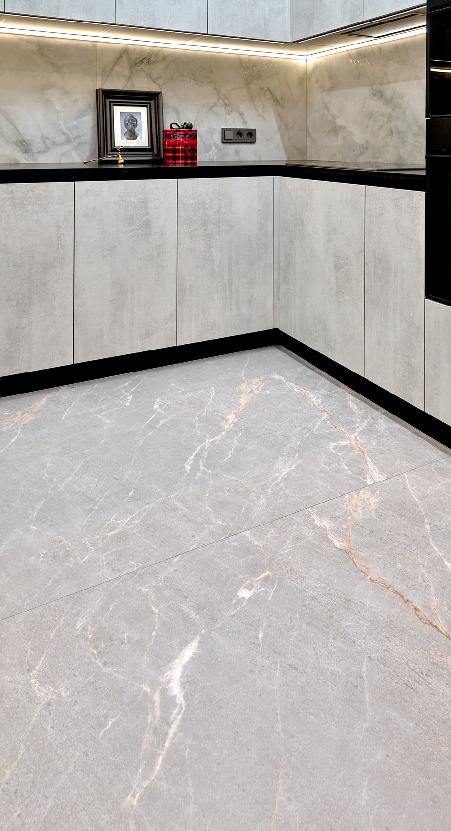 Фартук подбирали под отделку фасадов кухонной мебели. Очень близкий по цвету к кухне мы нашли индийский керамогранит форматом 80*160, под серый мрамор, с эффектом карвинга.