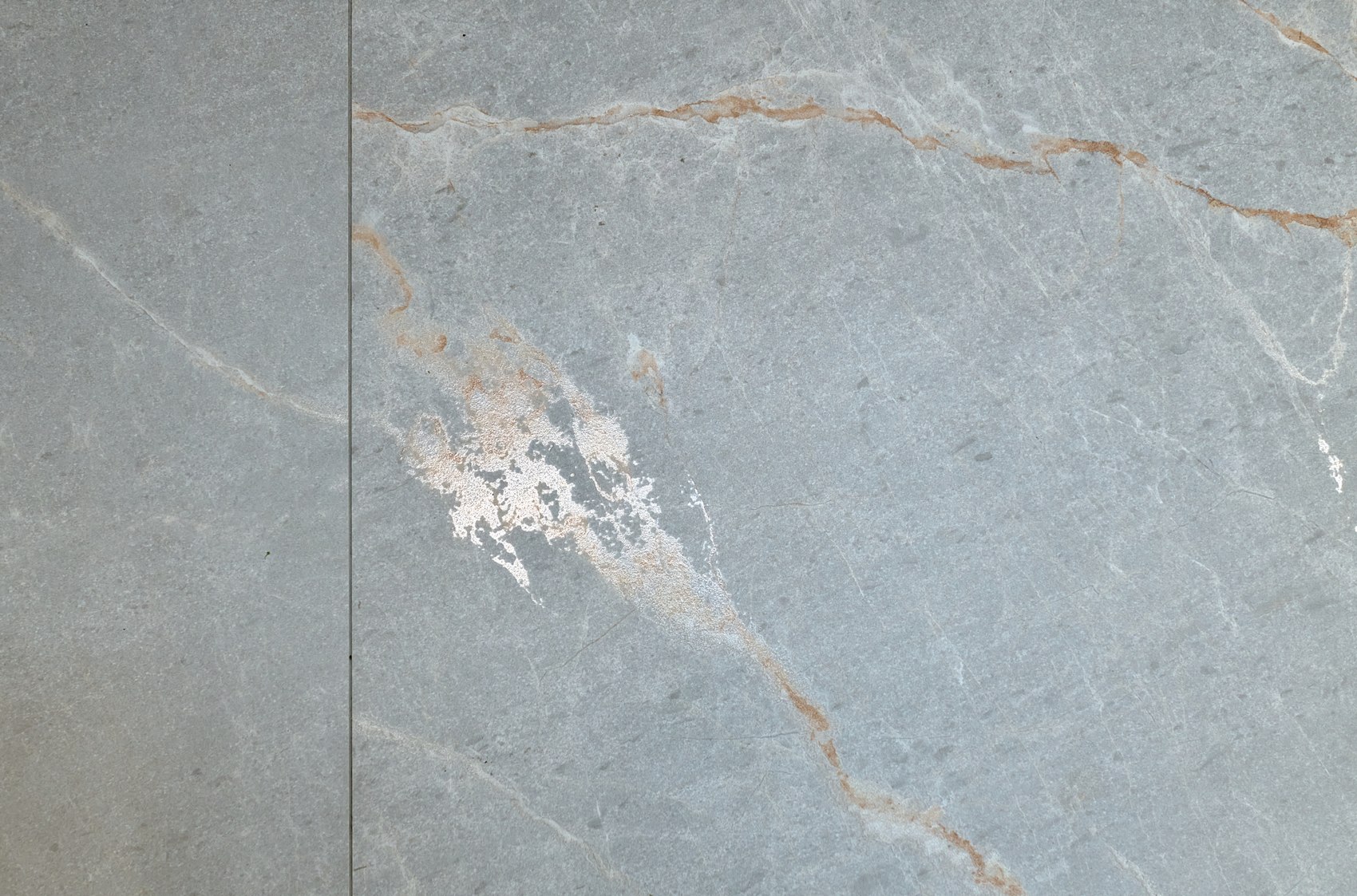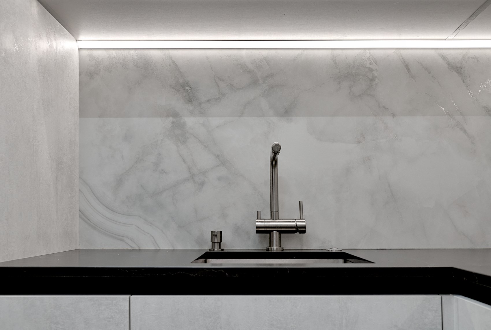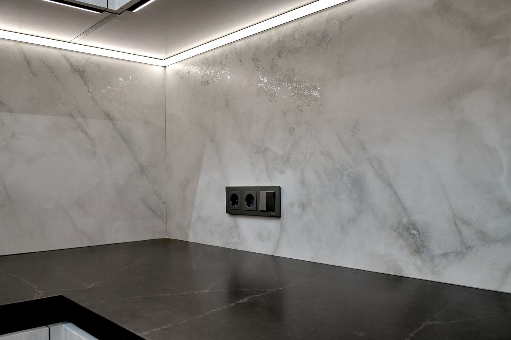 Фартук подбирали под отделку фасадов кухонной мебели. Очень близкий по цвету к кухне мы нашли индийский керамогранит форматом 80*160, под серый мрамор, с эффектом карвинга.