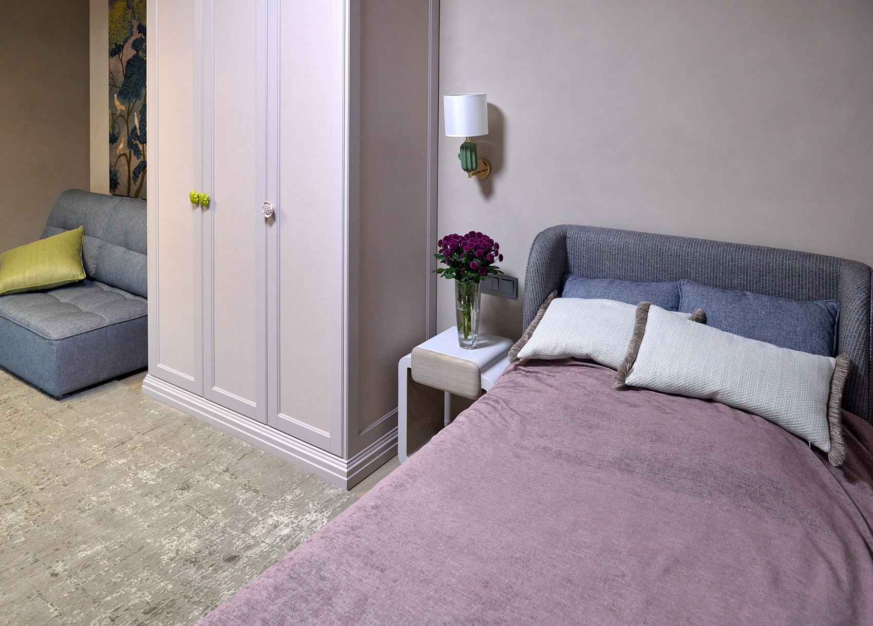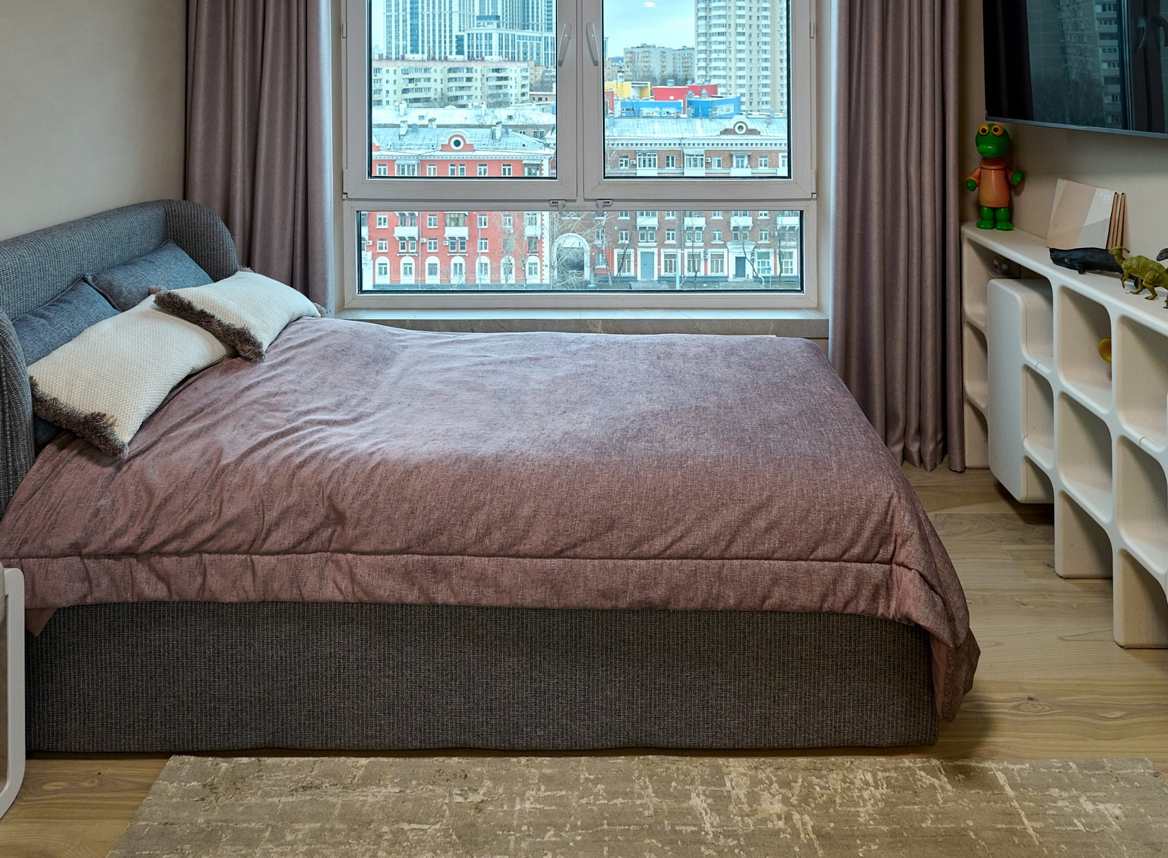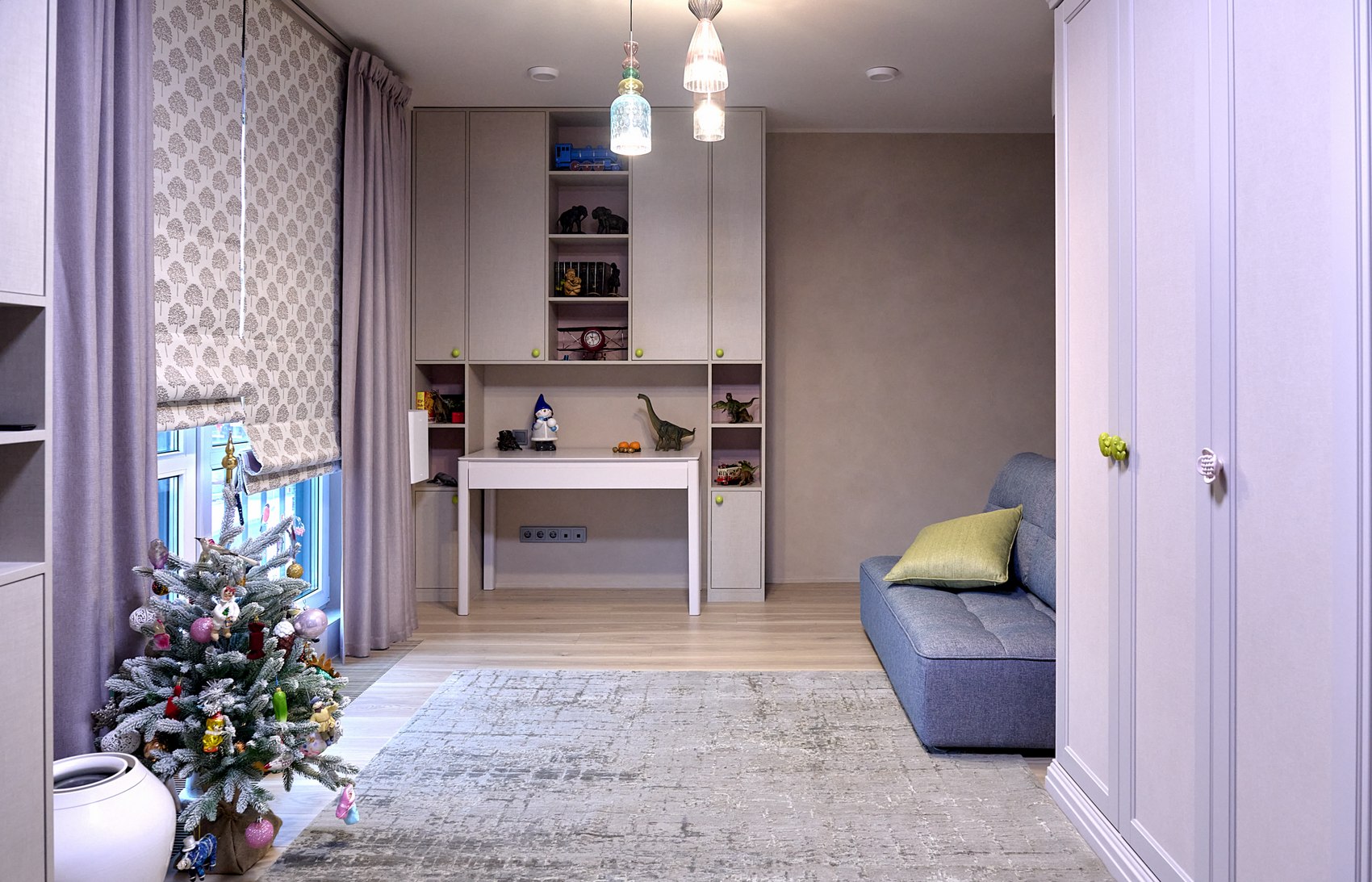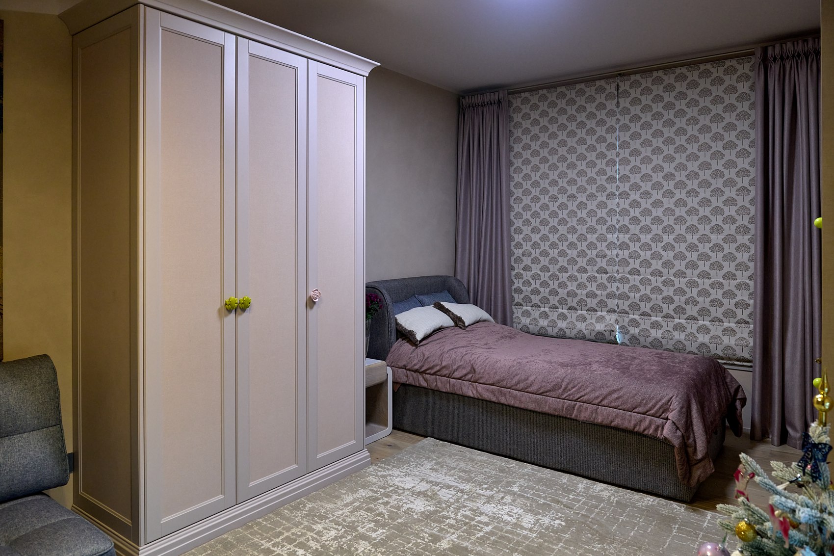 На шкаф в детской комнате поклеены обои выбранные в Мастердоме, там же приобретался весь текстиль на окна (полный комплекс работ - от замеров, выбора тканей, до пошива и навески). И также подобраны ткани и сшиты покрывала на кровати в детской и в основной спальне.