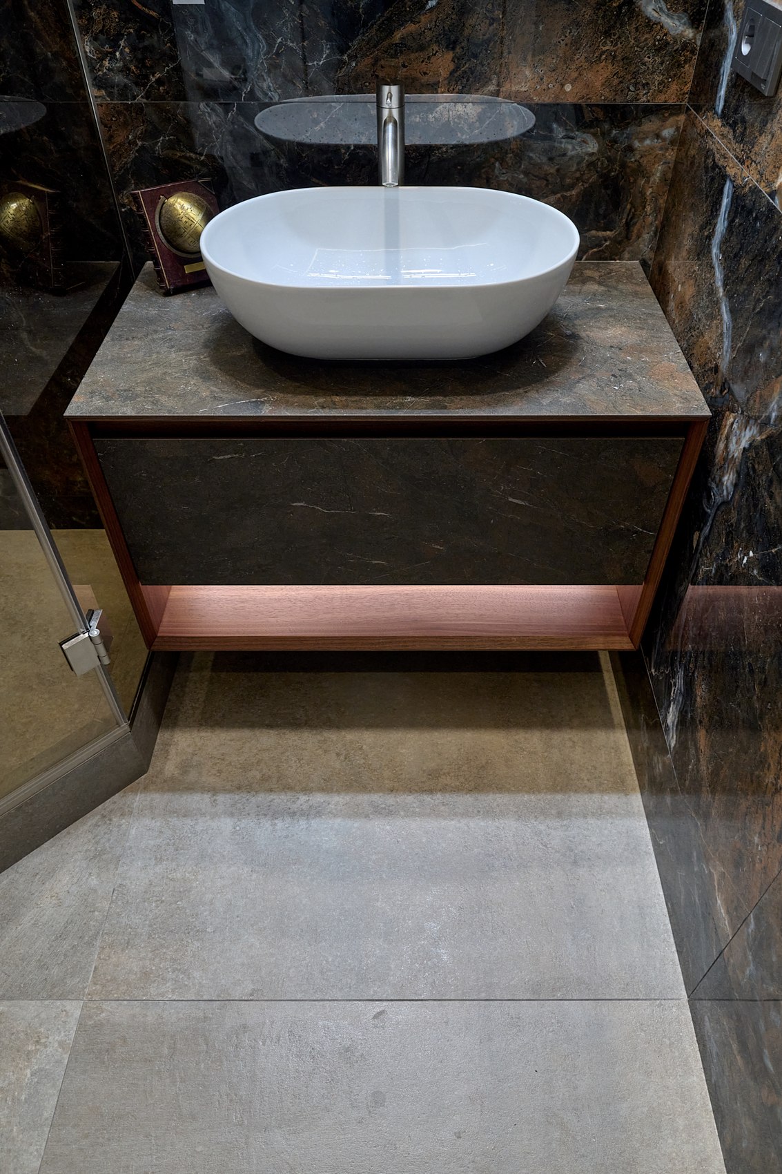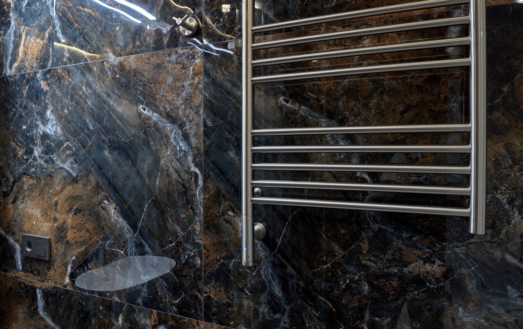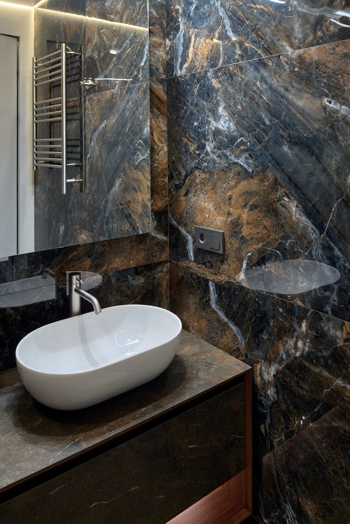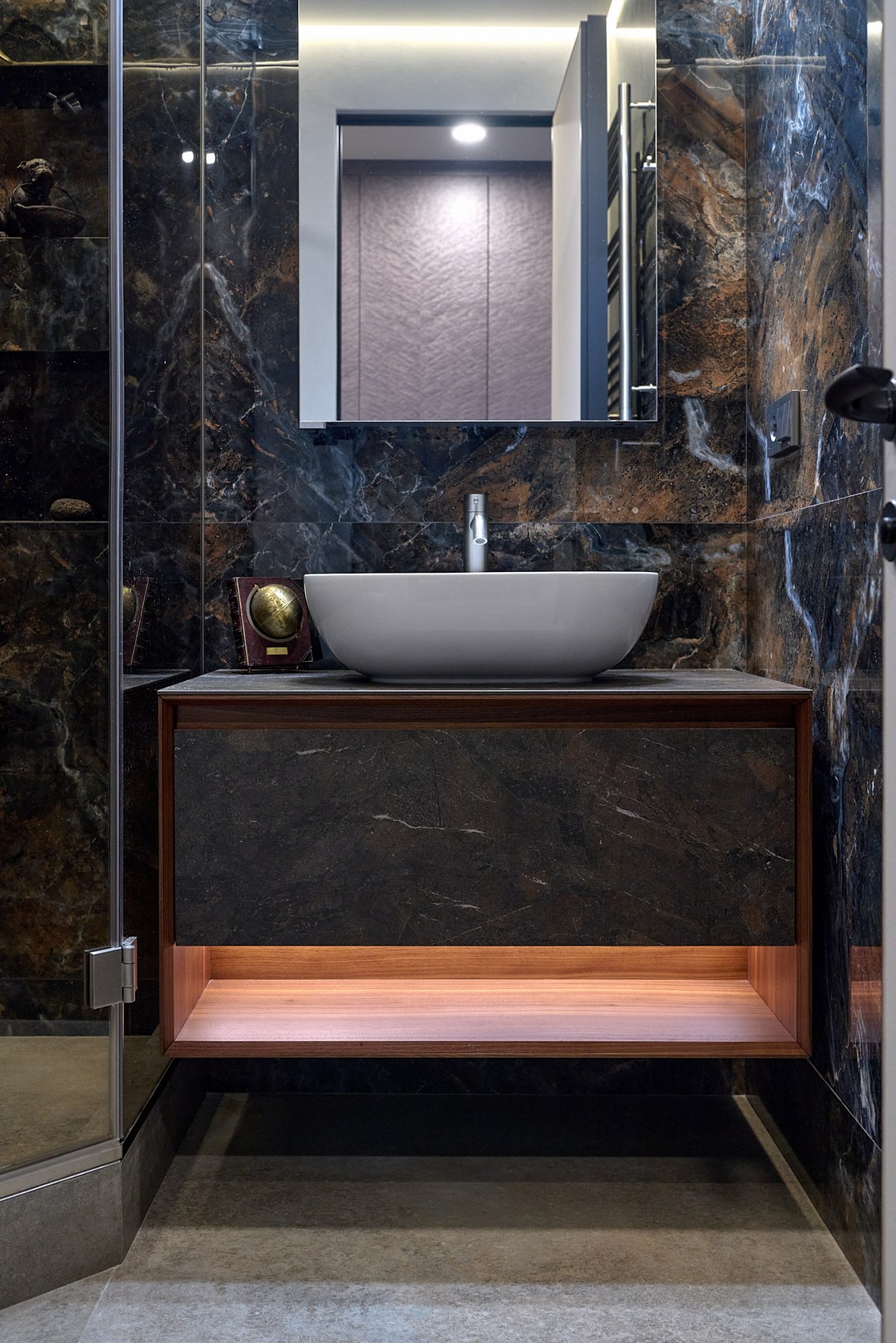 Компания МастерДом помогла реализовать идеи двух санузлов. Заказчикам очень понравился индийский керамогранит с потрясающим "космическим" рисунком. И мы решили сделать три стены в санузле из этого керамогранита. Разбавили на полу спокойным материалом и одну стену сделали в декоративной штукатурке (микроцемент).