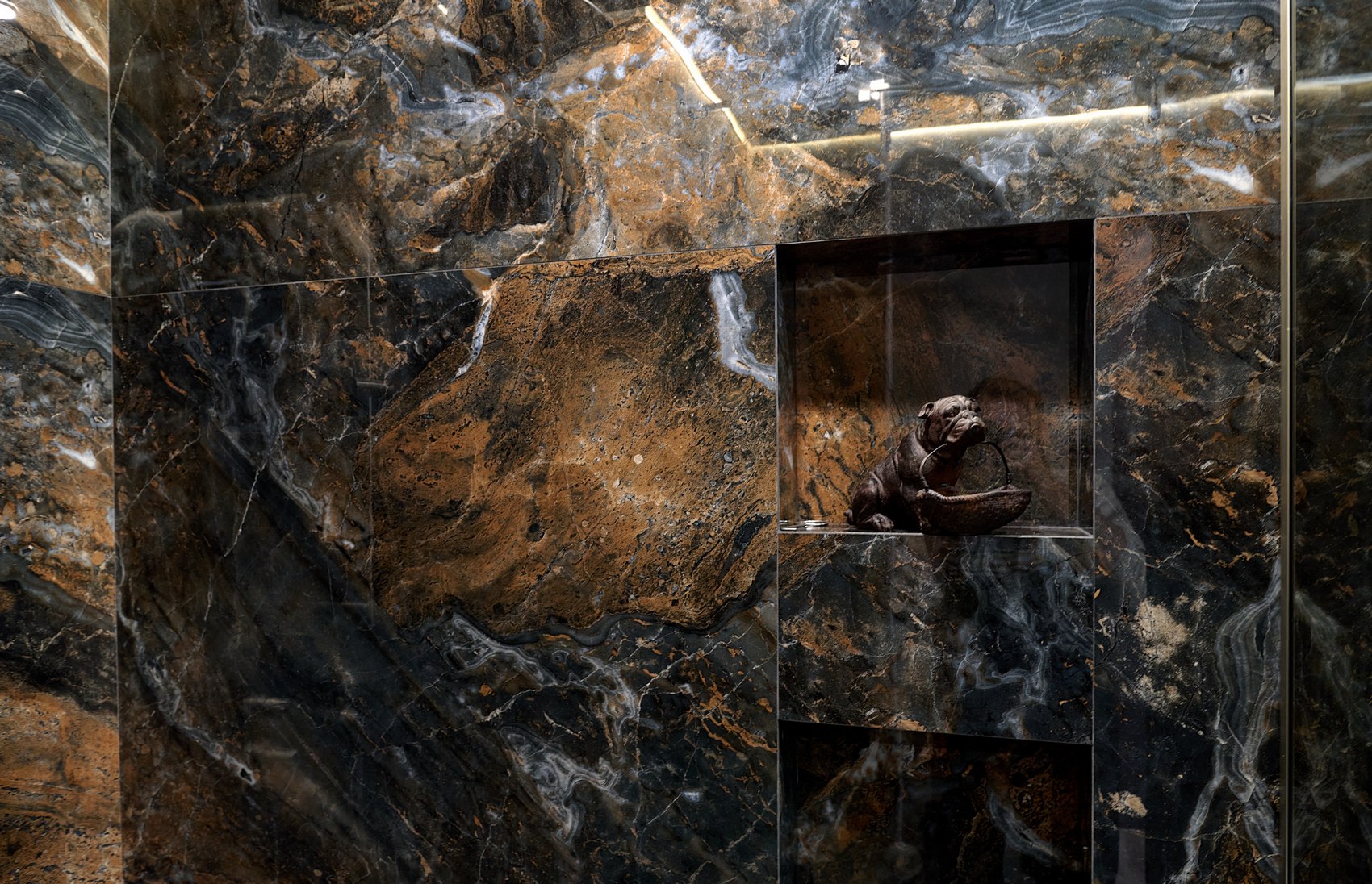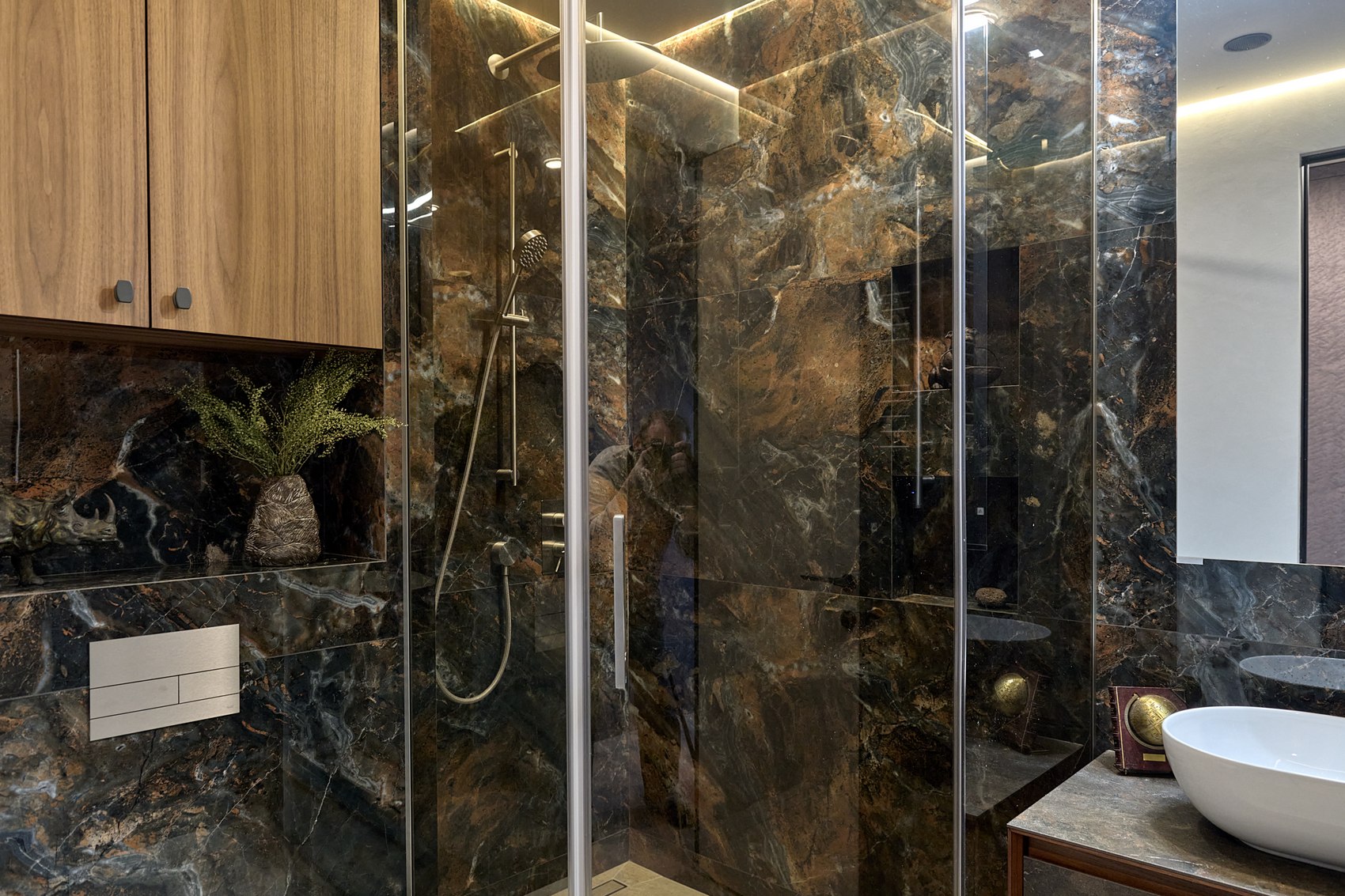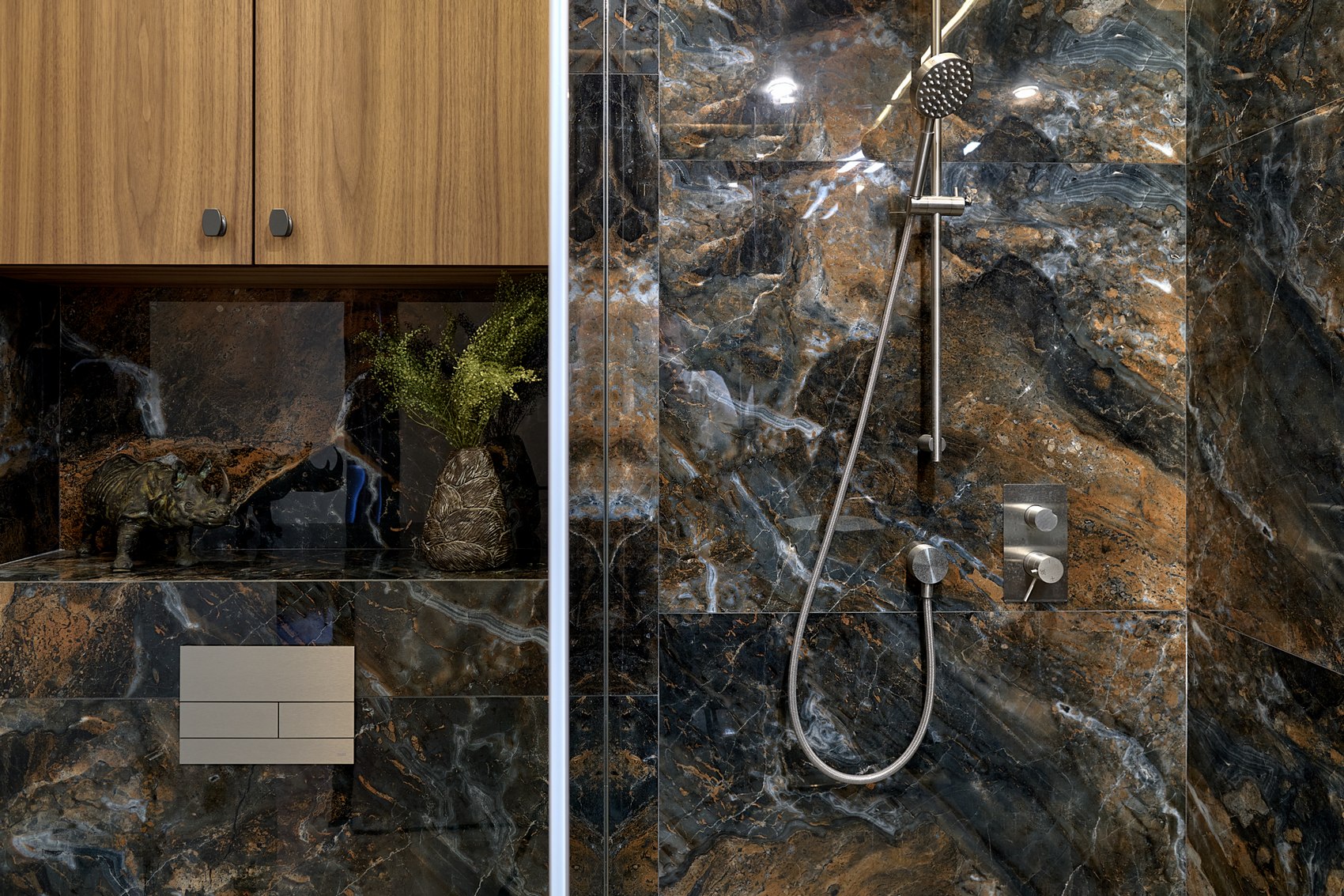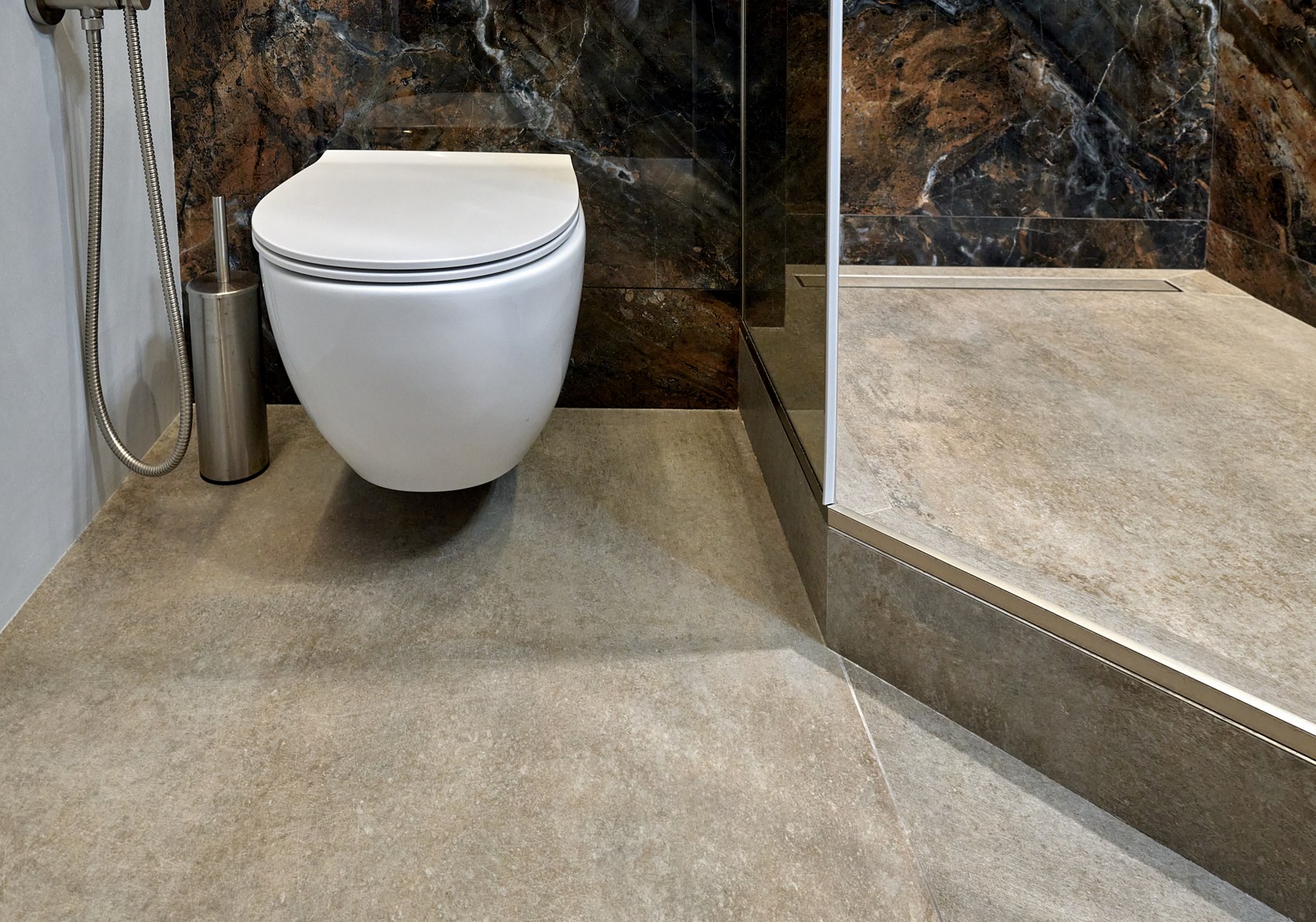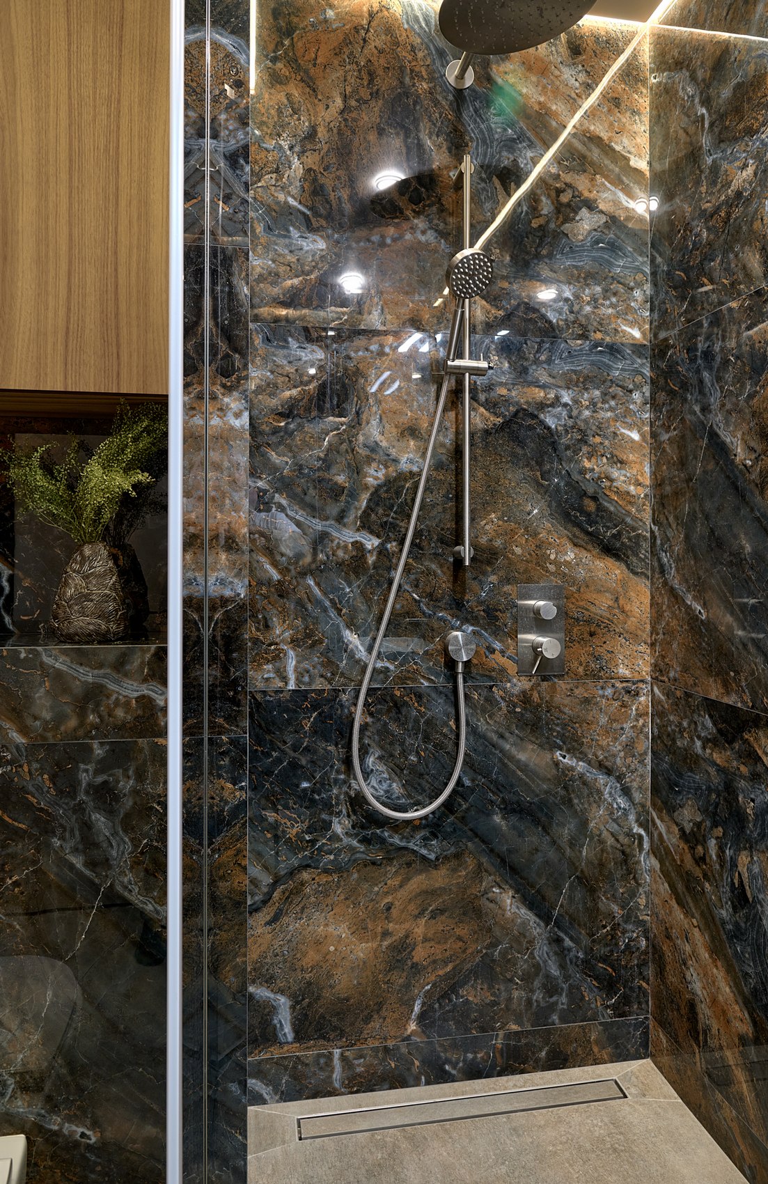 Компания МастерДом помогла реализовать идеи двух санузлов. Заказчикам очень понравился индийский керамогранит с потрясающим "космическим" рисунком. И мы решили сделать три стены в санузле из этого керамогранита. Разбавили на полу спокойным материалом и одну стену сделали в декоративной штукатурке (микроцемент).