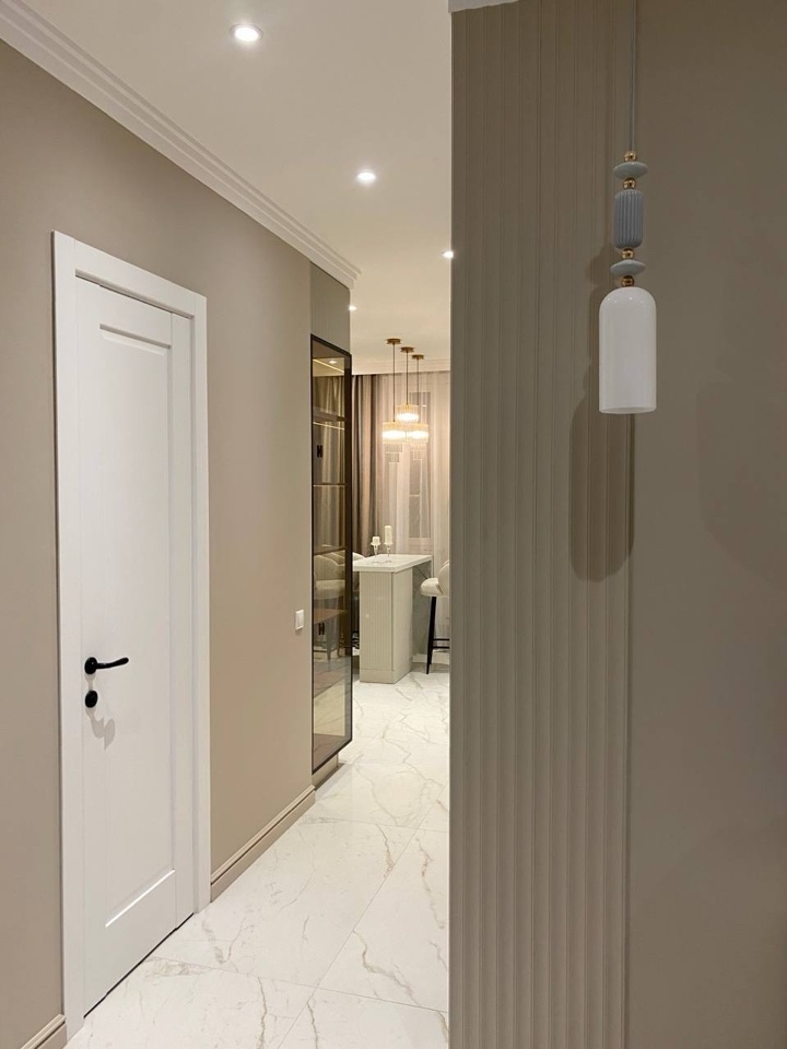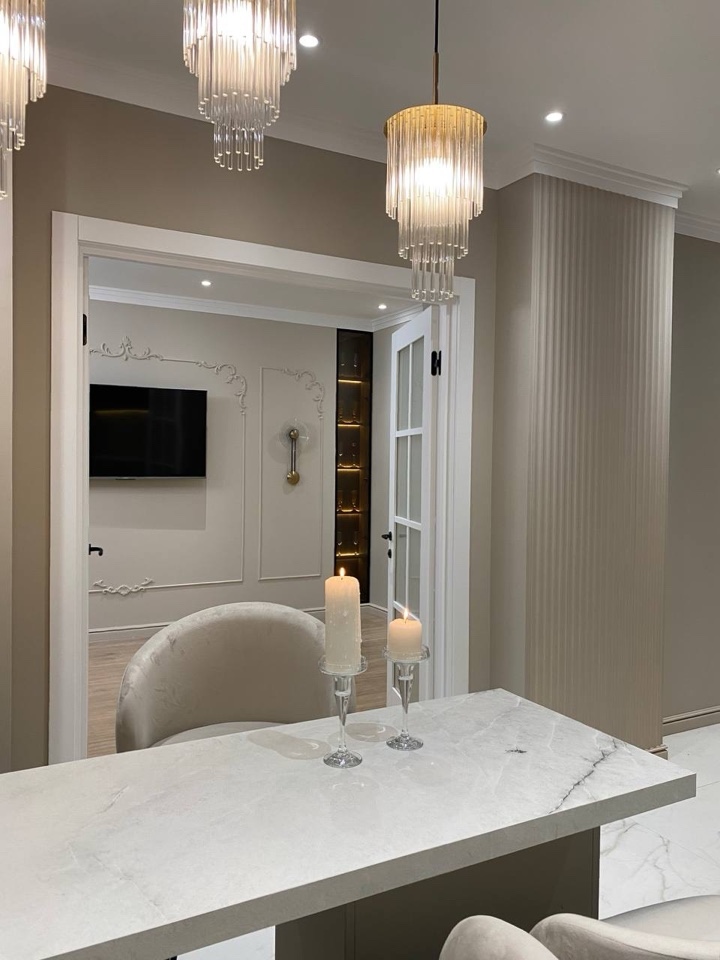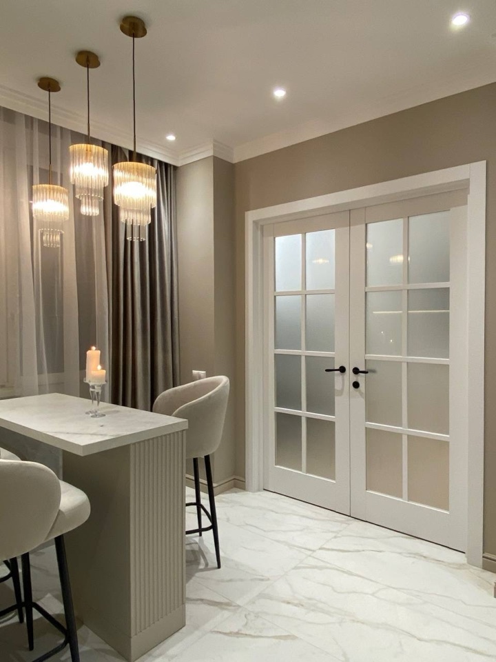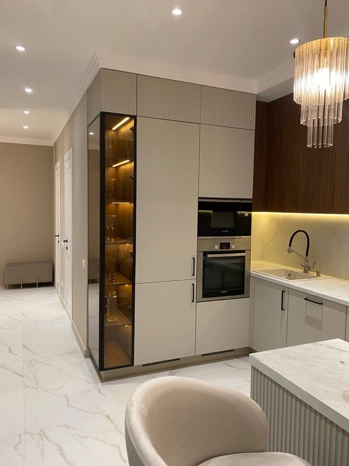 Белый керамогранитный мрамор на кухне создает элегантный и современный вид, придавая пространству светлую и воздушную атмосферу.
