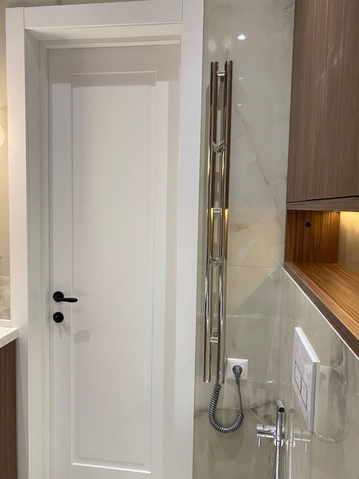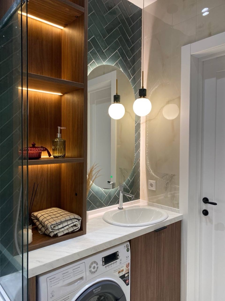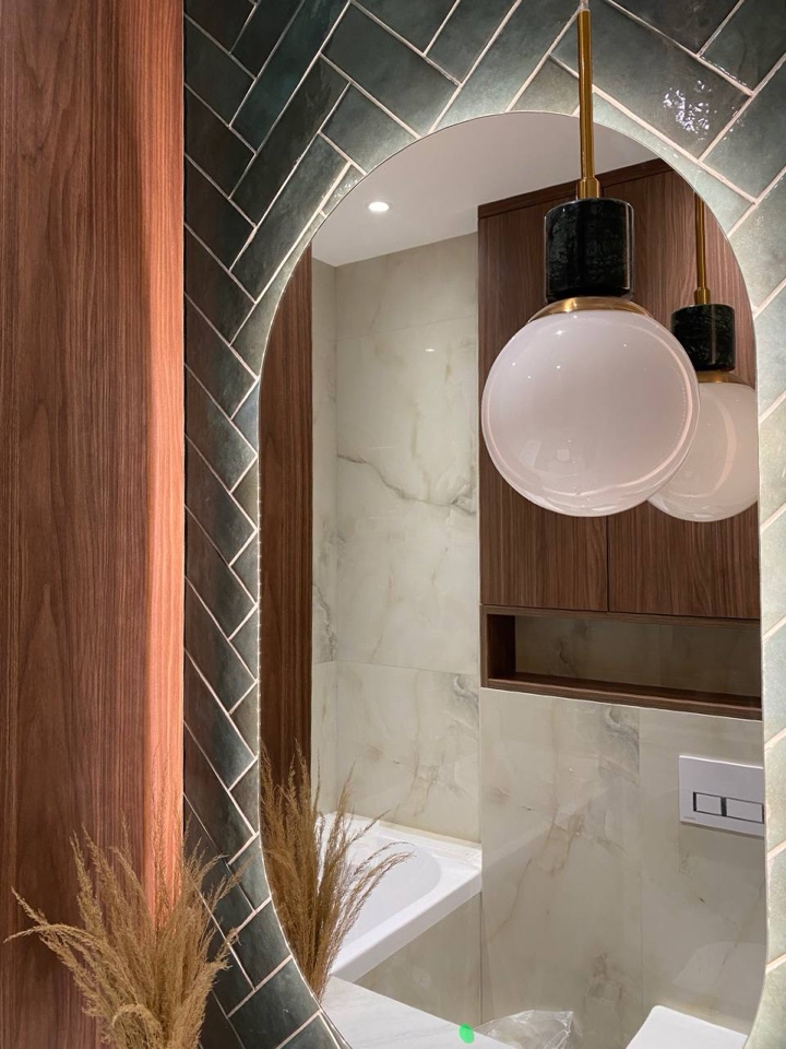 Деревянные элементы мебели с тёплым оттенком контрастируют с прохладными тонами плитки, придавая интерьеру уют и баланс. Такое сочетание материалов и цветов создает стильный и гармоничный ансамбль.
