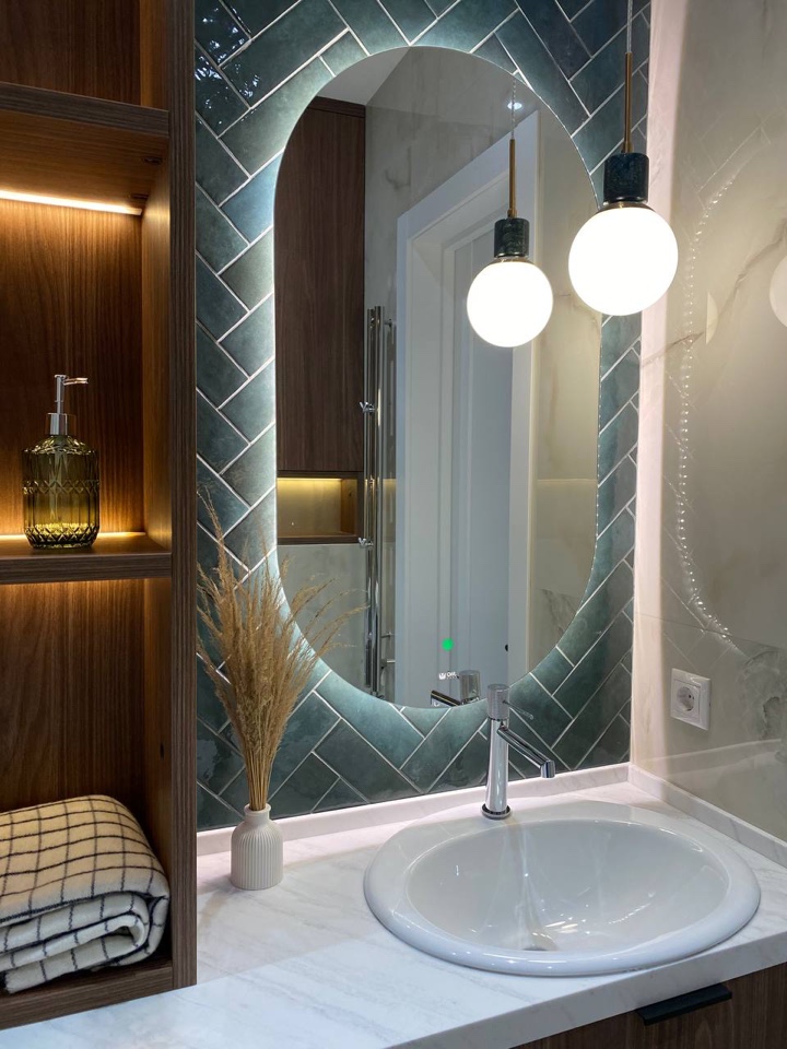 Плитка, уложенная "елочкой", как в данном интерьере, придает фактурность и выразительность пространству. Она становится ключевым акцентом в комнате, создавая иллюзию волны. Эффект создается благодаря грамотно подобранной подсветке, которая создает глянцевую текстуру и игру света на поверхности.