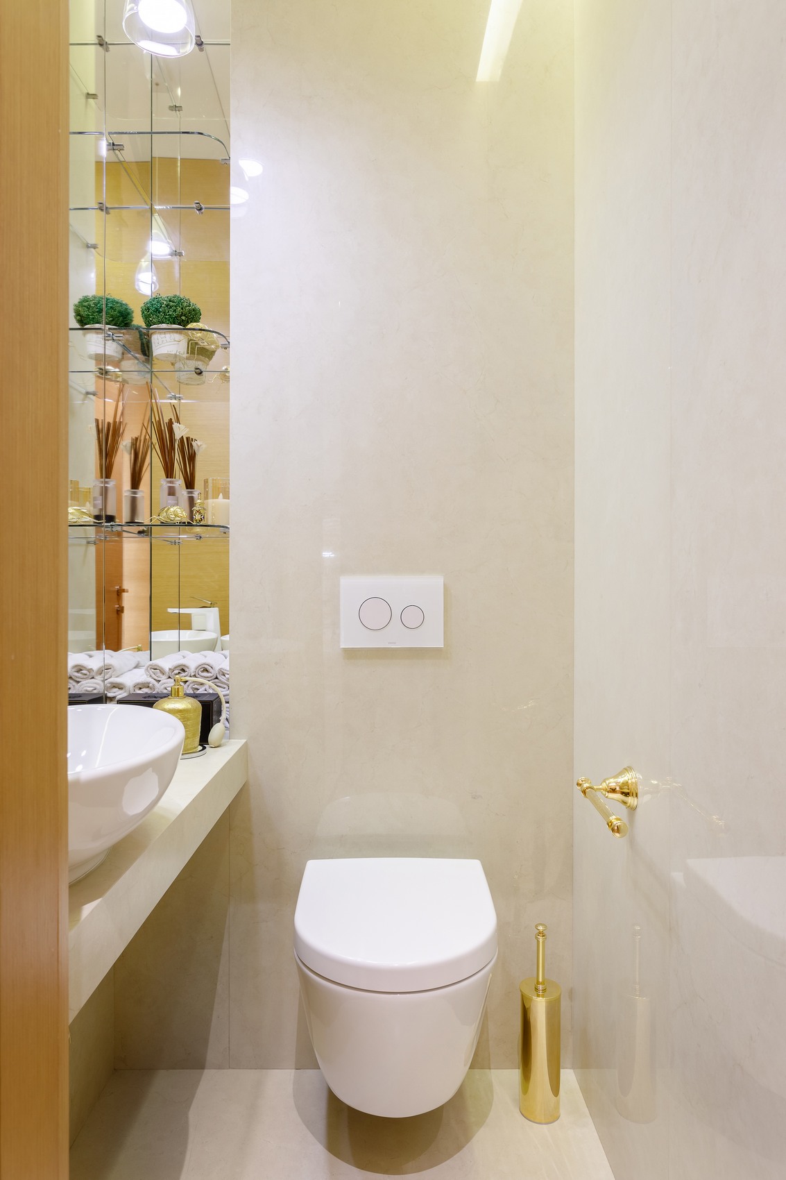 Мебель - минималистичная, фасады тумбы под раковиной - сочетание рельефного серо-голубого и тёплого дерева с золотыми ручками, что придаёт дизайну характер и завершённость.