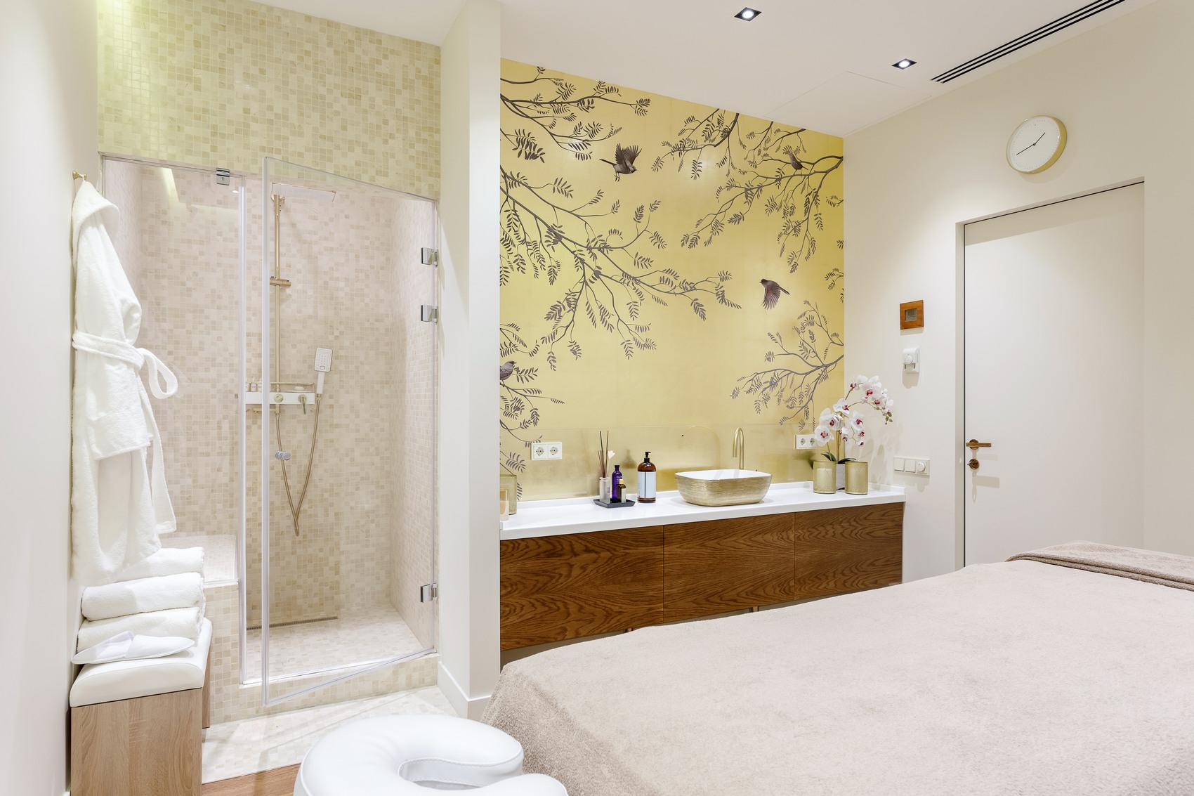 В интерьере используются светлые и золотые оттенки, что придает пространству природную легкость, динамику и лёгкий «арт»-оттенок за счет ярких и выразительных деталей, панно и аксессуаров.