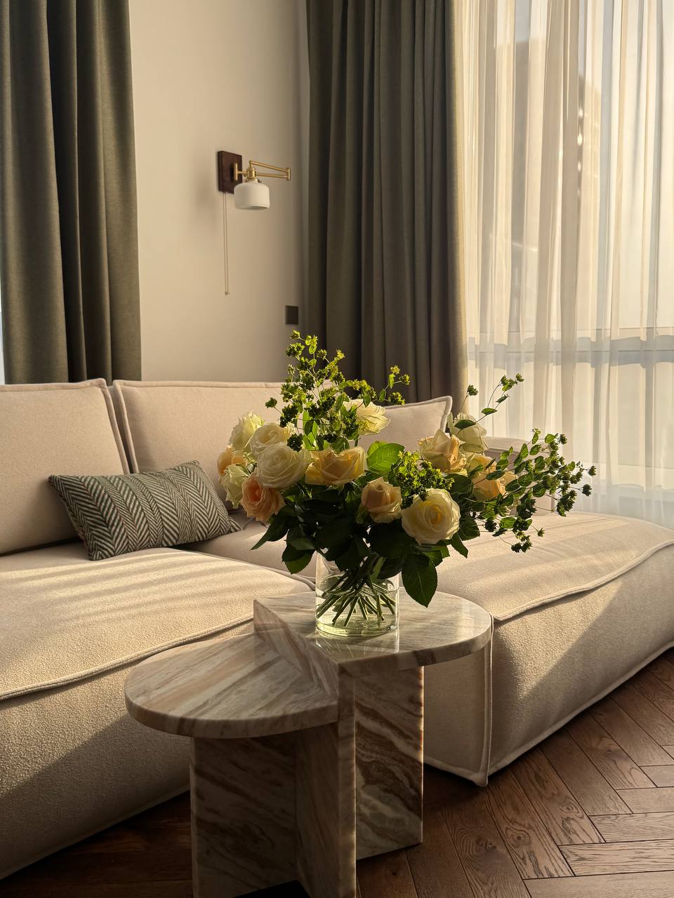 В этом проекте мы собрали спокойную, «дорогую» палитру и сделали ставку на фактуры.