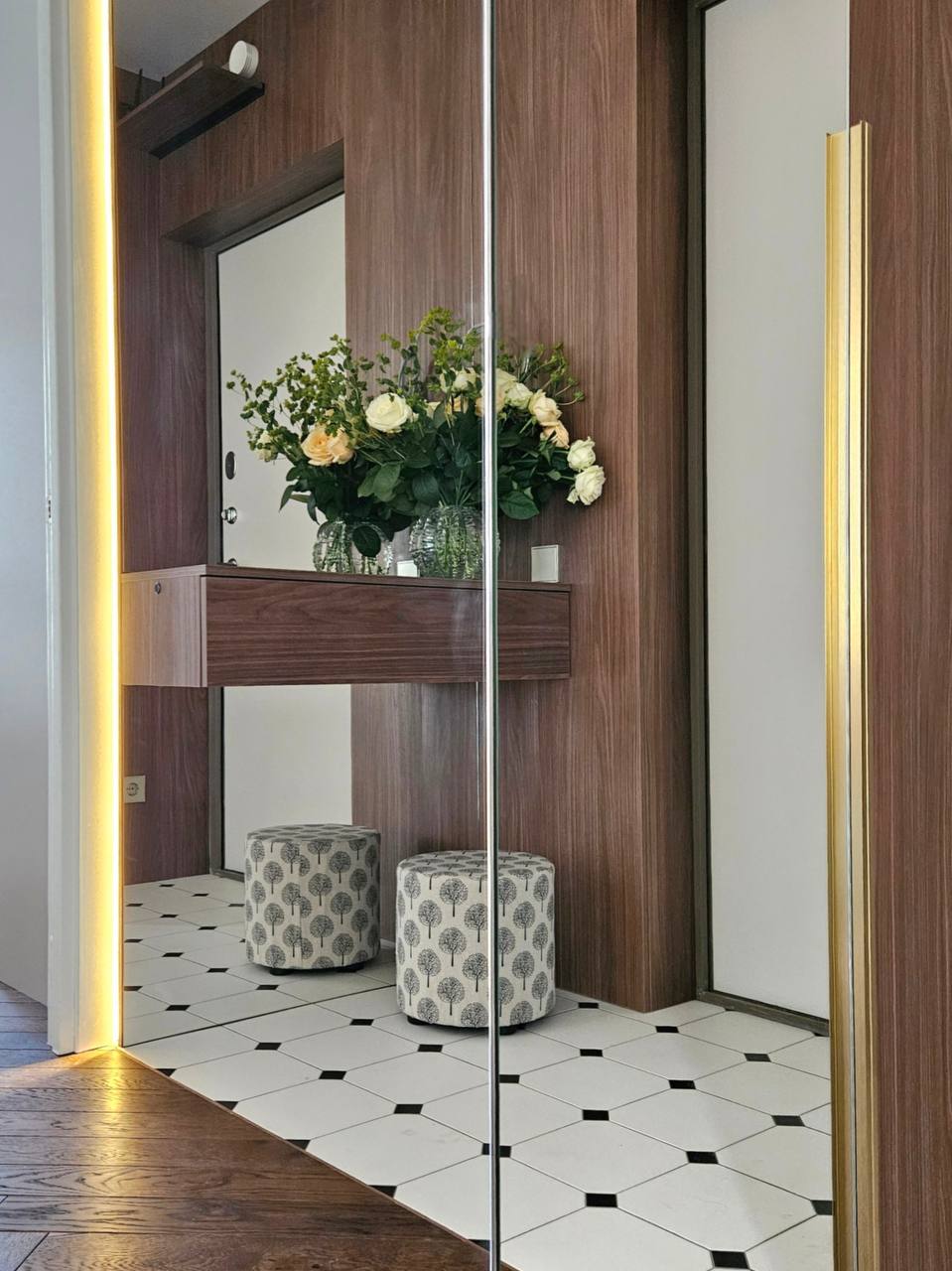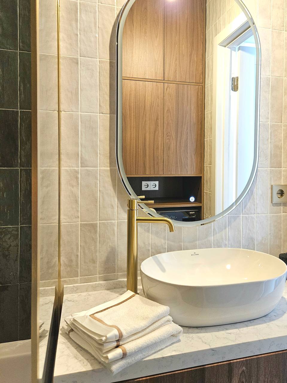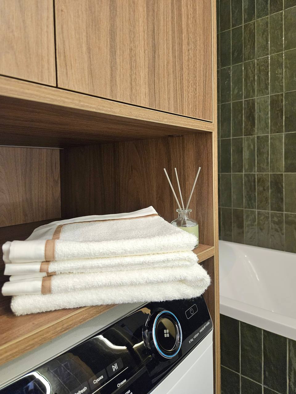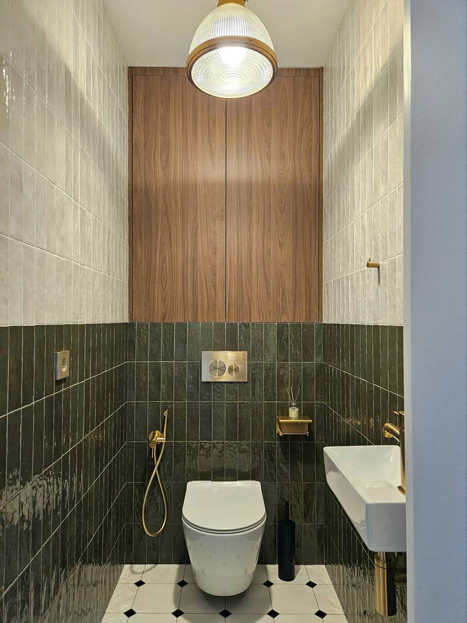 Санузел решён контрастно и графично: изумрудная глянцевая плитка внизу, светлая — сверху, плюс классический шестигранник на полу. В результате получился интерьер, который выглядит современно, но не «холодно» — с правильным балансом текстур, тепла дерева и благородных акцентов.
