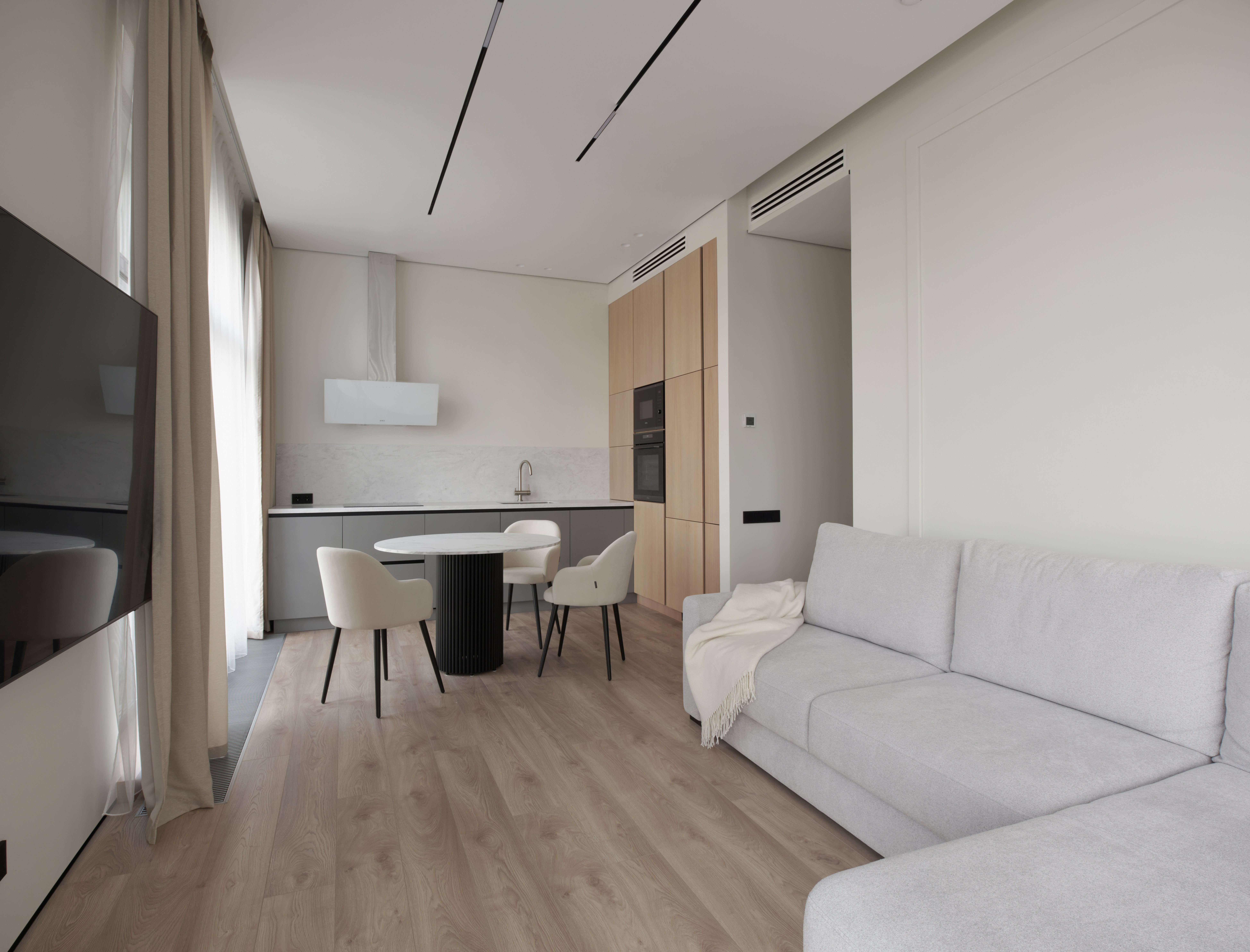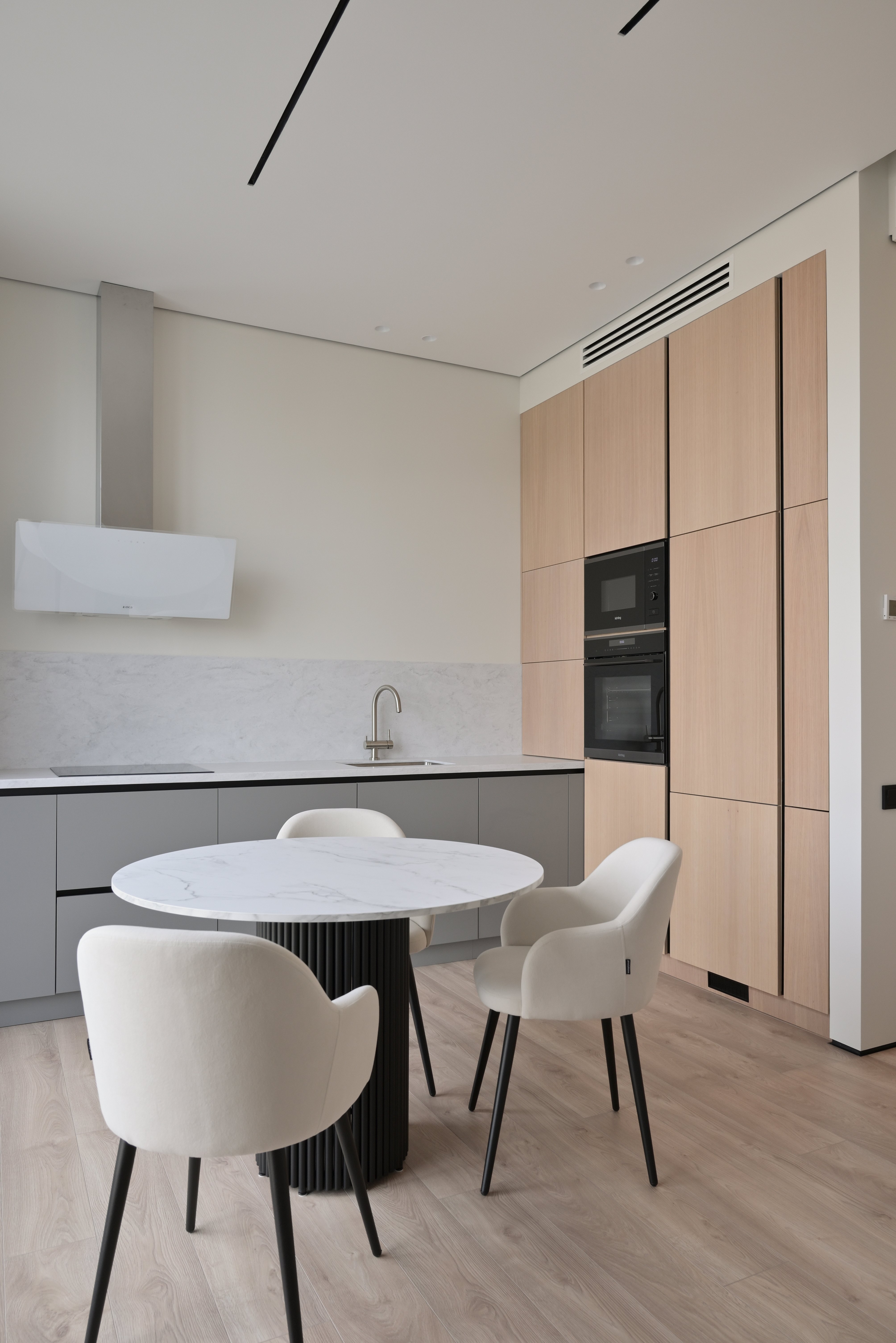 Кухня-гостиная оформлена в лаконичном современном стиле: встроенная кухня с деревянными фасадами и серыми нижними модулями сочетается с каменной рабочей поверхностью и фартуком. Обеденная зона с круглым столом и мягкими креслами формирует уютный центр пространства, а панорамные окна наполняют интерьер естественным светом.