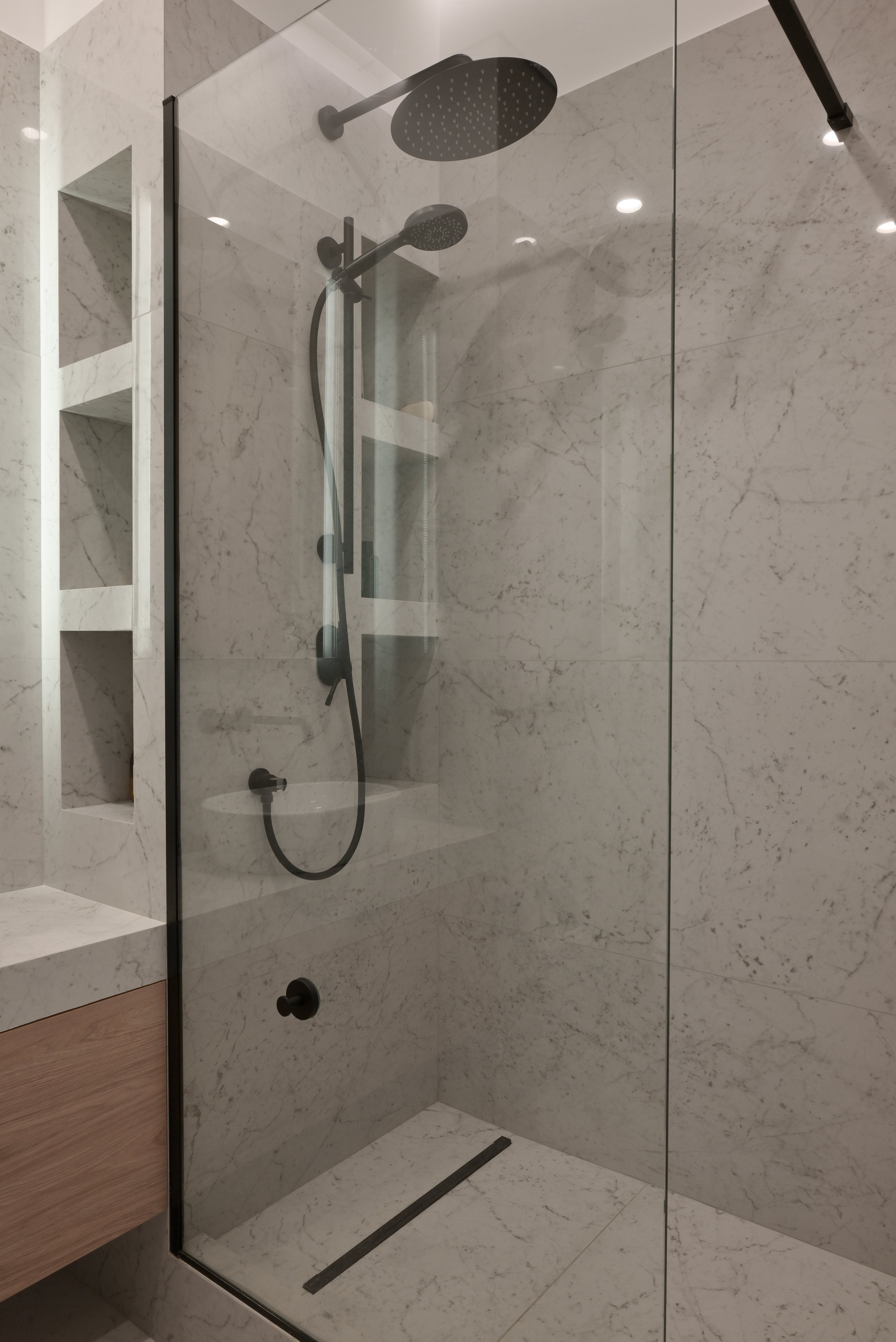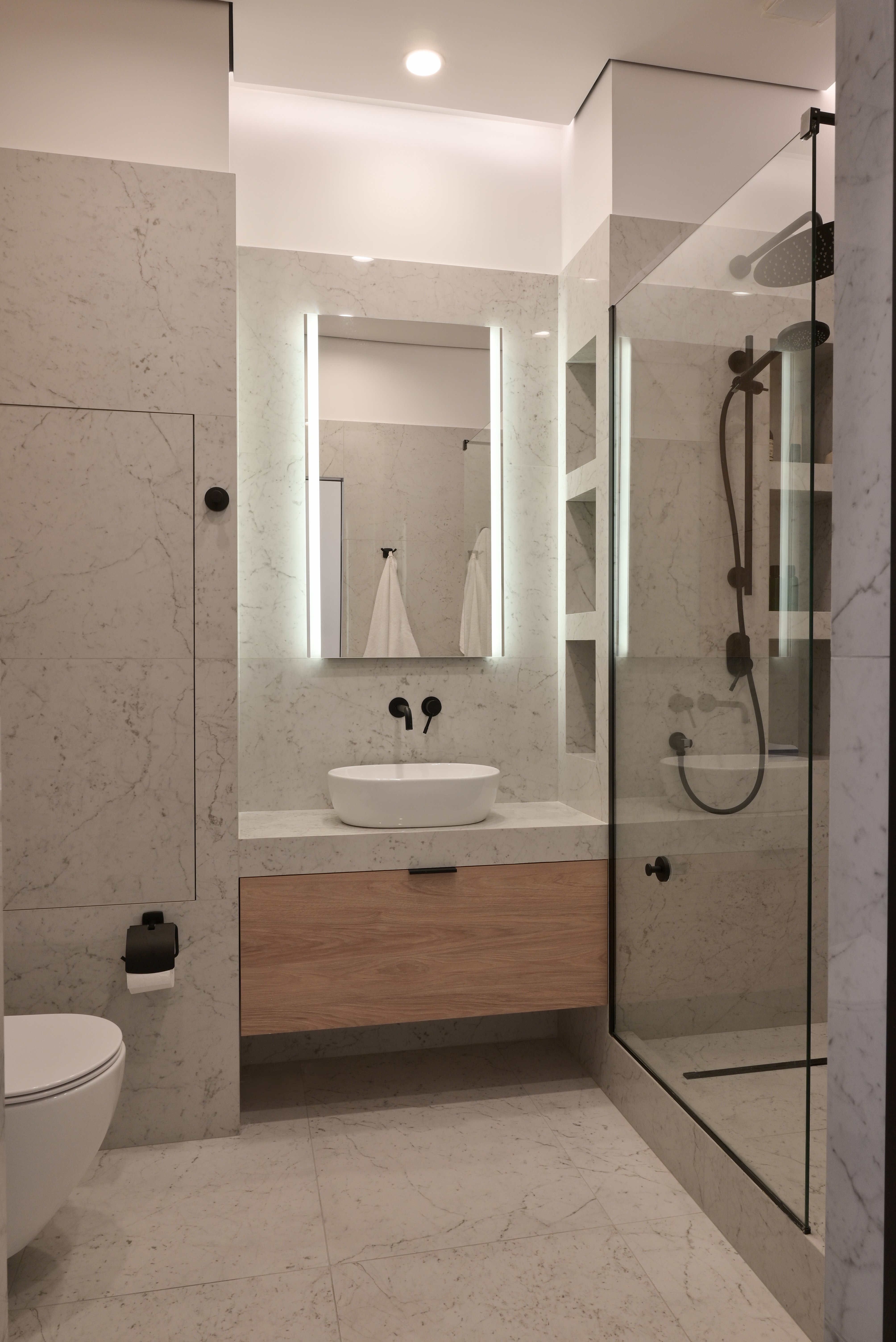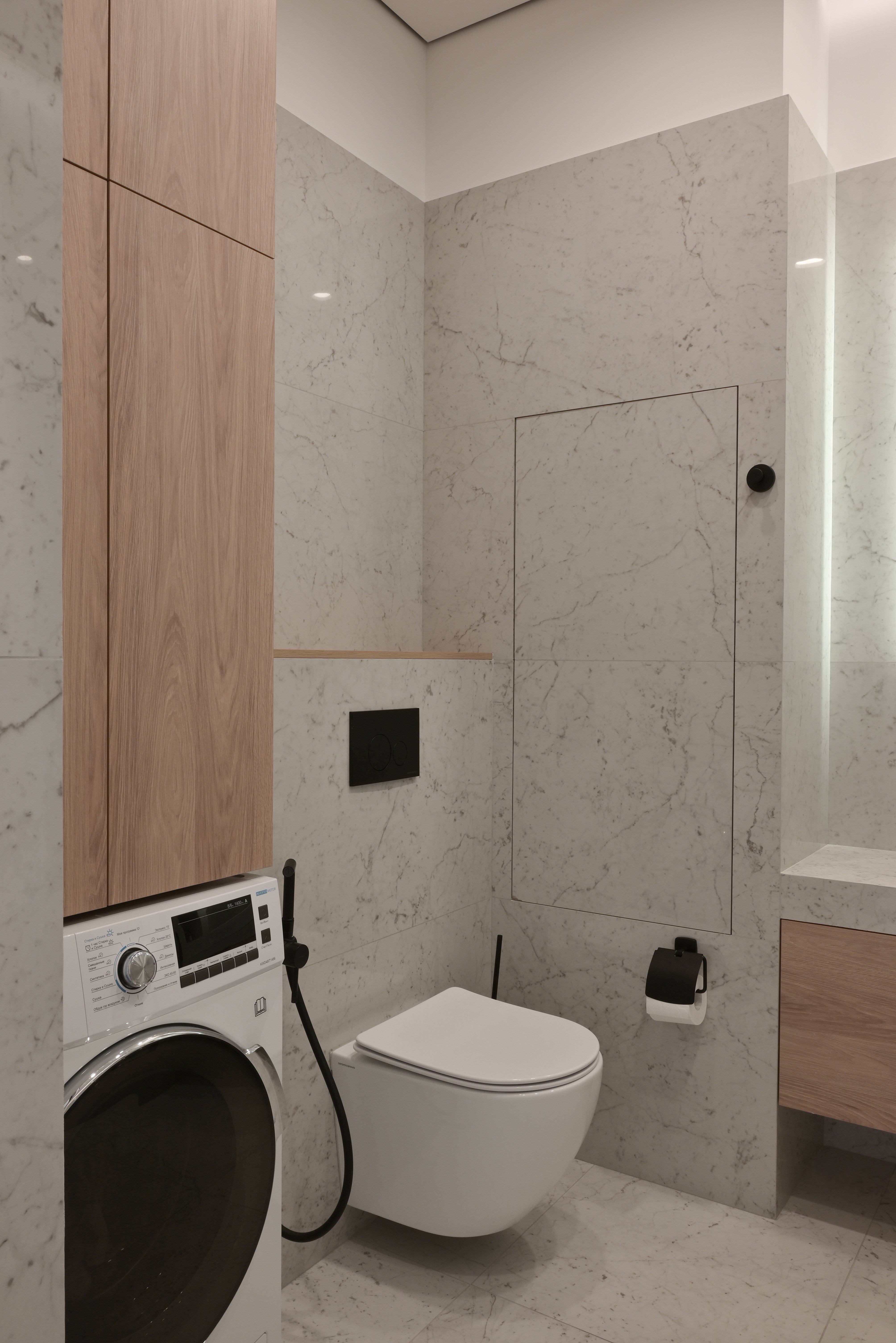 В ванной комнате использован крупноформатный керамогранит под светлый мрамор, который создает ощущение цельной каменной поверхности и визуально расширяет пространство. Минималистичная сантехника черного цвета, встроенные ниши и стеклянная душевая перегородка подчеркивают современный характер интерьера.